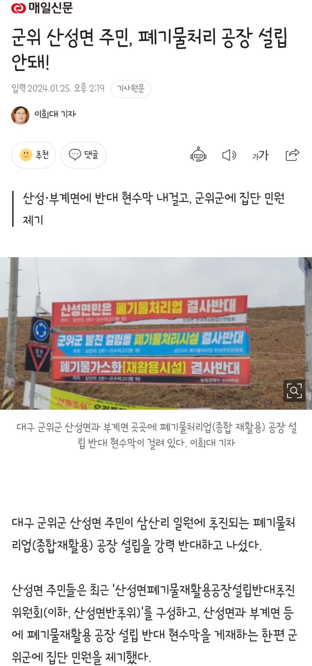 [여시뉴스데스크]군위 산성면 주민, 폐기물처리 공장 설립 안돼! 작성자강승호⠀|작성시간24.01.28|조회수613 목록 댓글 1 글자크기 작게가 글자크기 크게가 출처 : https://naver.me/Fu60tLDu군위 산성면 주민, 폐기물처리 공장 설립 안돼!대구 군위군 산성면 주민이 삼산리 일원에 추진되는 폐기물처리업(종합재활용) 공장 설립을 강력 반대하고 나섰다. 산성면 주민들은 최근 '산성면폐기물재활용공장설립반대추진위원회(이하, n.news.naver.com이하생략 다음검색 현재 게시글 추가 기능 열기 북마크 공유하기 신고 센터로 신고 댓글 댓글 1 댓글쓰기 답글쓰기 댓글 리스트 작성자먼데효호 | 작성시간 24.01.28 모든 사람들이 다 반대하겠지...솔직히 누가 좋아해. 자기네 거주지에 건강에 어떤 영향 끼칠지 모를 폐기물처리시설 온다고 하면... 걍 서울에 설치해. 사람 폐가 최고의 필터라는데 인구수도 많으니 좀 낫것지(나도 서울삼) 댓글 전체보기