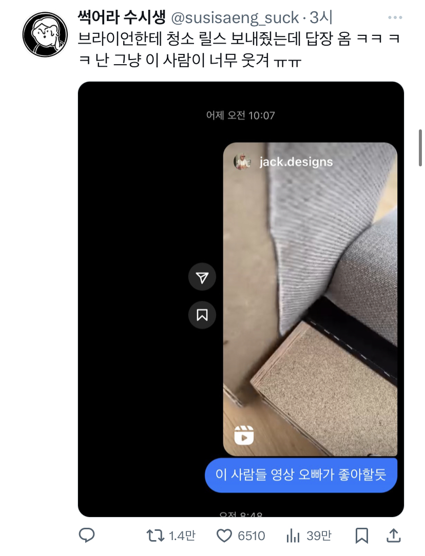 [스크랩] [흥미돋]브라이언한테 청소 릴스 보내줬는데 답장 옴 작성자Everything|작성시간24.01.28|조회수79,931 목록 댓글 32 글자크기 작게가 글자크기 크게가 출처 : https://theqoo.net/square/3073258840 다음검색 스크랩 원문 : *여성시대* 차분한 20대들의 알흠다운 공간 현재 게시글 추가 기능 열기 북마크 공유하기 신고 센터로 신고 댓글 댓글 32 댓글쓰기 답글쓰기 댓글 리스트 작성자가난한 상상력 너머 | 작성시간 24.01.28 ㅁㅊㅋㅋㅋㅋㅋㅋㅋㅋㅋㅋㅋㅋㅋㅋㅋ 작성자크로커스 | 작성시간 24.01.28 ㅋㅋㅋㅋ무슨 영상이길래 작성자서울은지금펑펑눈이와아 | 작성시간 24.01.28 먼 아는 사이같넼ㅋㅋㅋㅋ 작성자사과페이 | 작성시간 24.01.28 하시바 웃다가 허리삐끗함 ㅜ 작성자하바바rvd | 작성시간 24.01.28 ㅋㅋㅋㅋㅋㅋㅋㅋㅋㅋㅋㅋㅋㅋㅋㅋㅋㅋㅋㅋㅋㅋㅋㅋㅋㅋㅋㅋㅋㅋㅋㅋㅋㅋㅋㅋ 댓글 전체보기