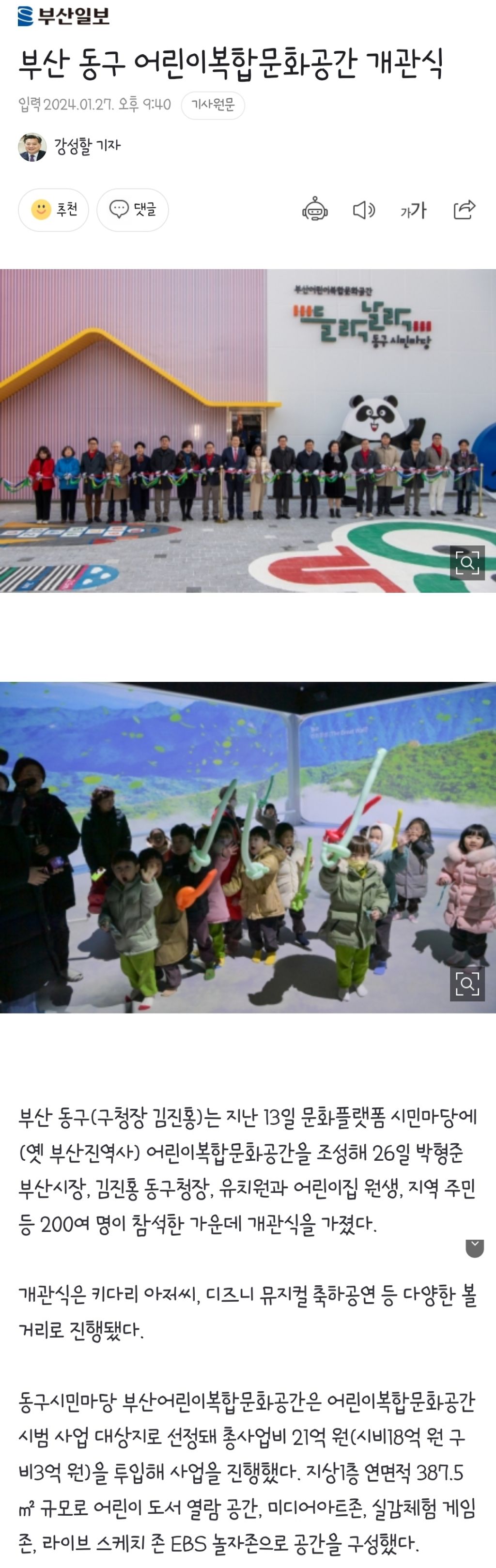 [여시뉴스데스크]부산 동구 어린이복합문화공간 개관식 작성자강승호⠀|작성시간24.01.28|조회수1,701 목록 댓글 1 글자크기 작게가 글자크기 크게가 출처 : https://naver.me/xQ8LMYJF부산 동구 어린이복합문화공간 개관식부산 동구(구청장 김진홍)는 지난 13일 문화플랫폼 시민마당에(옛 부산진역사) 어린이복합문화공간을 조성해 26일 박형준 부산시장, 김진홍 동구청장, 유치원과 어린이집 원생, 지역 주민 등 200n.news.naver.com이하생략 다음검색 현재 게시글 추가 기능 열기 북마크 공유하기 신고 센터로 신고 댓글 댓글 1 댓글쓰기 답글쓰기 댓글 리스트 작성자朝倉 穣 | 작성시간 24.01.28 귀여워 댓글 전체보기