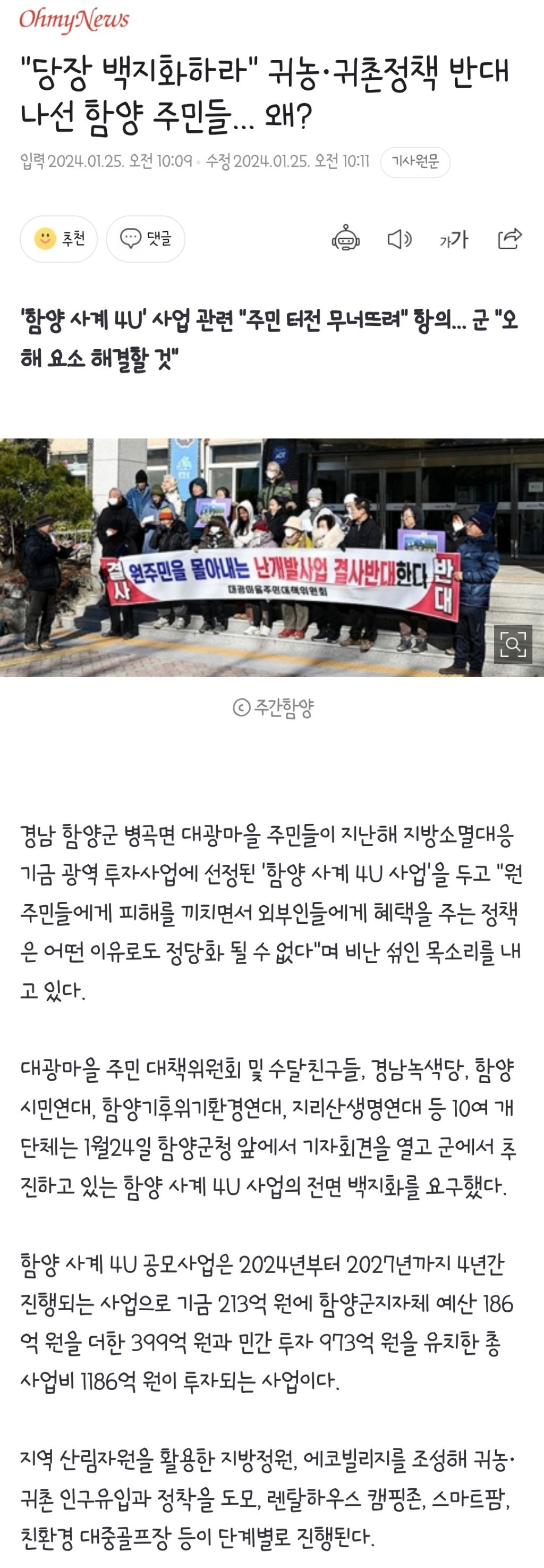 [여시뉴스데스크]"당장 백지화하라" 귀농·귀촌정책 반대 나선 함양 주민들... 왜? 작성자강승호⠀|작성시간24.01.28|조회수1,777 목록 댓글 7 글자크기 작게가 글자크기 크게가 출처 : https://naver.me/5jmDr2Gv"당장 백지화하라" 귀농·귀촌정책 반대 나선 함양 주민들... 왜?'함양 사계 4U' 사업 관련 "주민 터전 무너뜨려" 항의... 군 "오해 요소 해결할 것" ⓒ 주간함양 경남 함양군 병곡면 대광마을 주민들이 지난해 지방소멸대응기금 광역 투자사업에 선정된 '함양 사n.news.naver.com이하생략 다음검색 현재 게시글 추가 기능 열기 북마크 공유하기 신고 센터로 신고 댓글 댓글 7 댓글쓰기 답글쓰기 댓글 리스트 작성자꿈꾸는달콤한솜사탕 | 작성시간 24.01.28 골프장에 친환경이 어디있어 진짜....나같아도 반대하지 작성자락스가싸악녹여줘 | 작성시간 24.01.28 미친 골프장빼 작성자레드향맛있음 | 작성시간 24.02.03 글씨체머얀..? 넘 이뿌네 답댓글 작성자강승호⠀ 작성자 본인 여부 작성자 | 작성시간 24.02.04 이지은체야! 답댓글 작성자레드향맛있음 | 작성시간 24.02.04 고마워 ♡♡♡ 댓글 전체보기