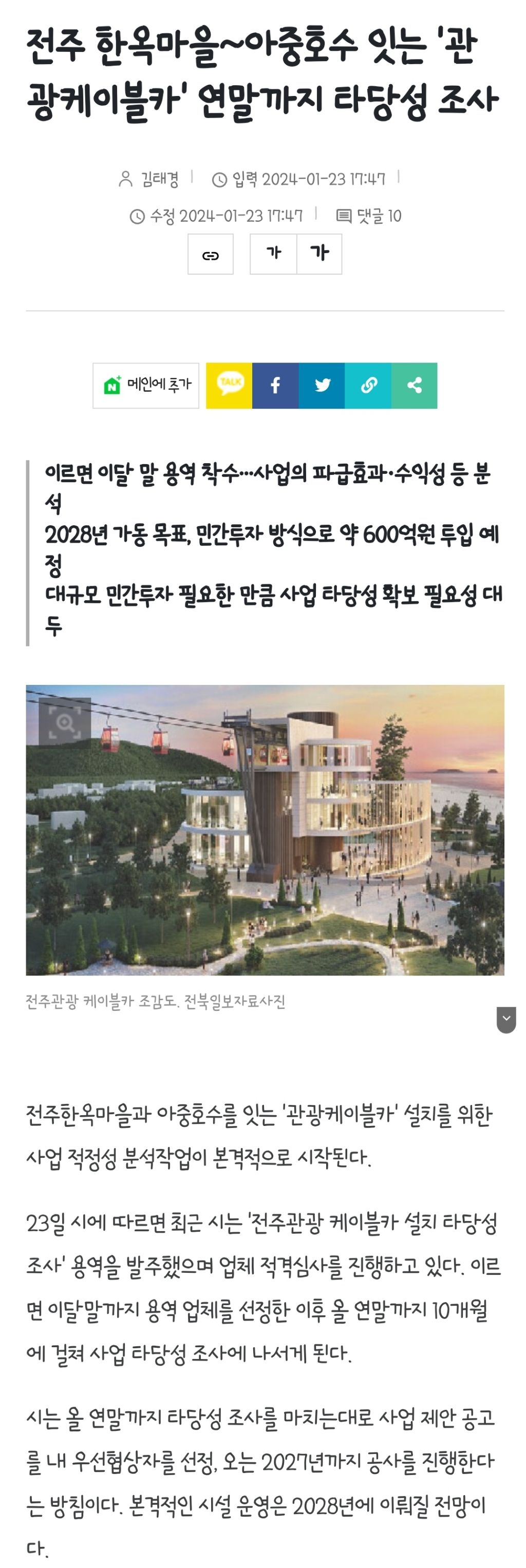 [여시뉴스데스크]전주 한옥마을~아중호수 잇는 '관광케이블카' 연말까지 타당성 조사 작성자강승호⠀|작성시간24.01.28|조회수5,475 목록 댓글 19 글자크기 작게가 글자크기 크게가 출처 : https://www.jjan.kr/article/20240123580207전주 한옥마을~아중호수 잇는 '관광케이블카' 연말까지 타당성 조사전주한옥마을과 아중호수를 잇는 '관광케이블카' 설치를 위한 사업 적정성 분석작업이 본격적으로 시작된다. 23일 시에 따르면 최근 시는 '전주관광 케이블카 설치 타당성 조사' 용역을 발주했www.jjan.kr이하생략 다음검색 현재 게시글 추가 기능 열기 북마크 공유하기 신고 센터로 신고 댓글 댓글 19 댓글쓰기 답글쓰기 댓글 리스트 작성자쥬드 벨링엄 | 작성시간 24.01.28 굳이...? 버스노선이나 더 만들어 작성자둠디다닷다 | 작성시간 24.01.28 제발 정신좀 차려; 케이블카는 무슨 케이블카야 작성자오만과편두통 | 작성시간 24.01.28 엥? 미쳤음? 예산이 그리 남아돔???? 케이블카 설치할 높이도 안될거같이생겼는데 이 무슨.... 작성자윤종로 | 작성시간 24.01.28 버스기사고 노선이고 노답인데 그거 강화부터 했으면.. 작성자배놀이 | 작성시간 24.01.28 와이라노 댓글 전체보기