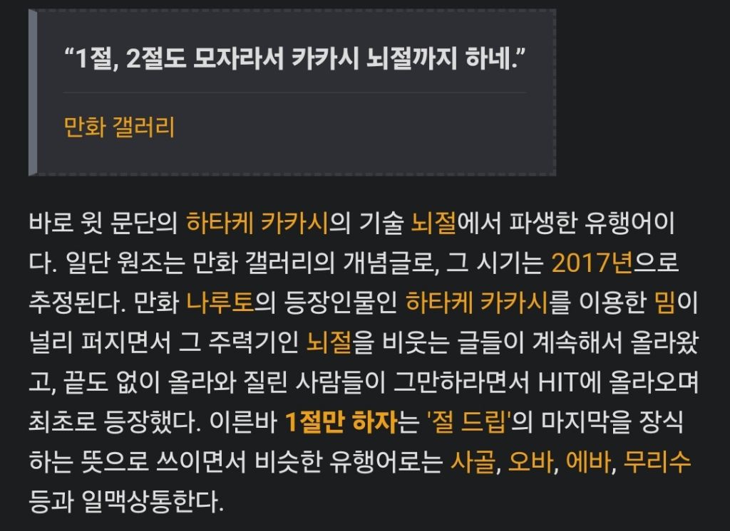 뇌절이란 밈도 많이 쓰고 카카시 뇌절이란 기술도 너무 잘 알고있었는데 저기서 파생된 밈인줄 전혀 생각도 못해봤어....