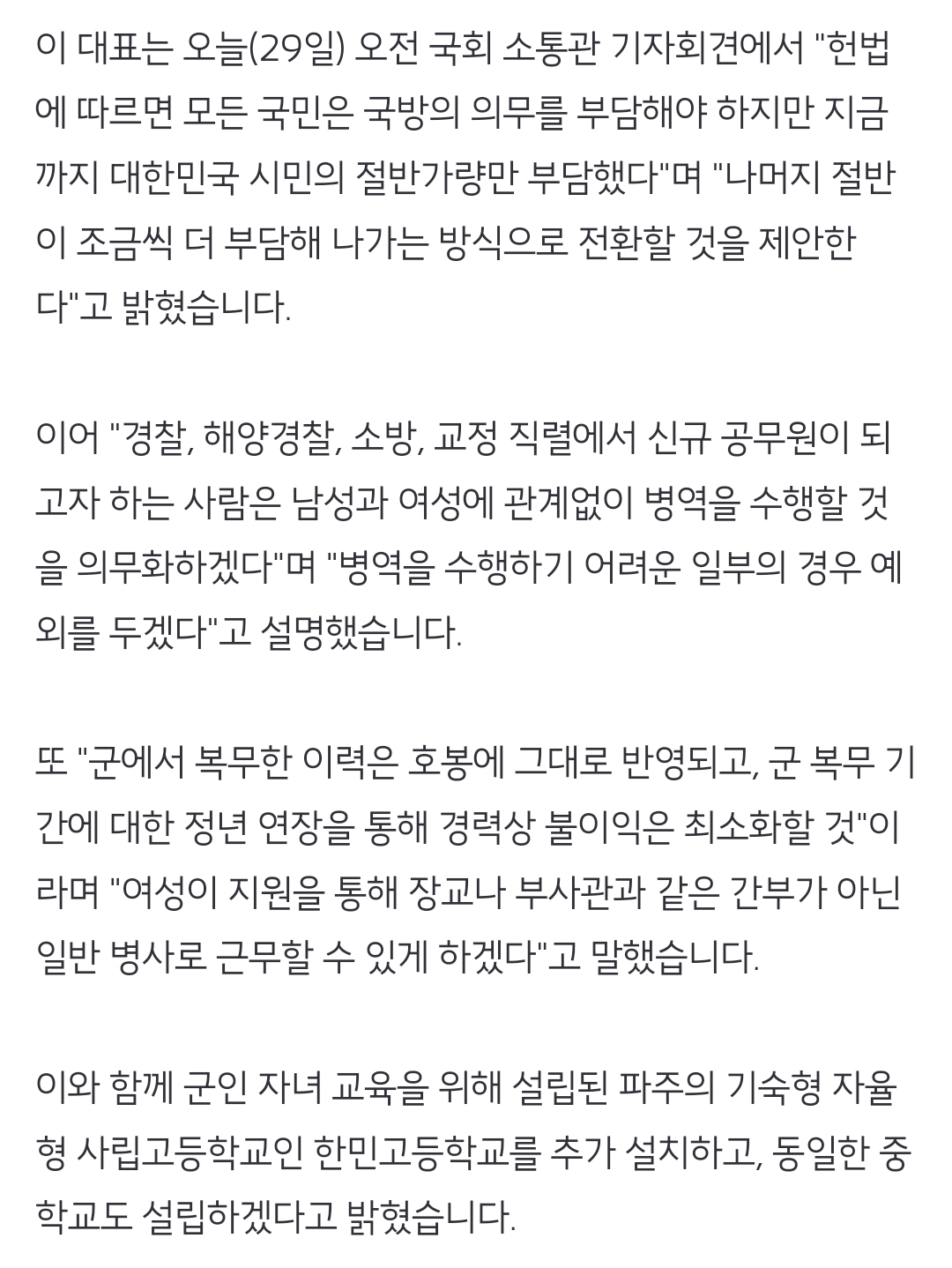 [여시뉴스데스크]이준석 "여성 신규 공무원 '군 복무 의무화' 제안"...총선 공약 발표 작성자나승현|작성시간24.01.29|조회수5,466 목록 댓글 89 글자크기 작게가 글자크기 크게가 출처 : https://n.news.naver.com/article/057/0001796053이준석 "여성 신규 공무원 '군 복무 의무화' 제안"...총선 공약 발표이준석 개혁신당 대표가 오는 4월 총선 공약으로 '여성 신규 공무원 병역 의무화' 방안을 내놓았습니다. 이 대표는 오늘(29일) 오전 국회 소통관 기자회견에서 "헌법에 따르면 모든 국민은 국방의n.news.naver.com 다음검색 현재 게시글 추가 기능 열기 북마크 공유하기 신고 센터로 신고 댓글 댓글 89 댓글쓰기 답글쓰기 댓글 리스트 작성자진달래주 | 작성시간 24.01.30 월200 받는 힐링캠프 가보자고~ 작성자와와헴 와와헴 | 작성시간 24.01.30 제발.. 보냐줘.. 삭제된 댓글입니다. 답댓글 작성자여시곰듀 | 작성시간 24.02.01 222....진짜 맞말 ㅋㅋㅋㅋㅋㅋㅋㅋㅋㅋㅋㅋㅋㅋㅋ군대안간자들이 더 많음서 ㅜ 꼴값 작성자디럭스허수아버지 | 작성시간 24.02.01 군캉스 가보자고!!나 사격왕되서 포상휴가 받아야지~ 댓글 전체보기