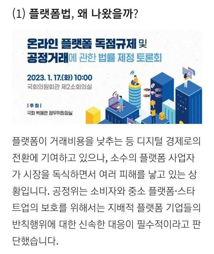 "플랫폼 사업자들도 전통 유통기업처럼 시장 독과점하면 규제 받아야함. 지금 법으론 못하니까 플랫폼법 만들거야. 우리 숙원사업이야. 지금못하면 역사의 죄인됨. 무조건 할거야"