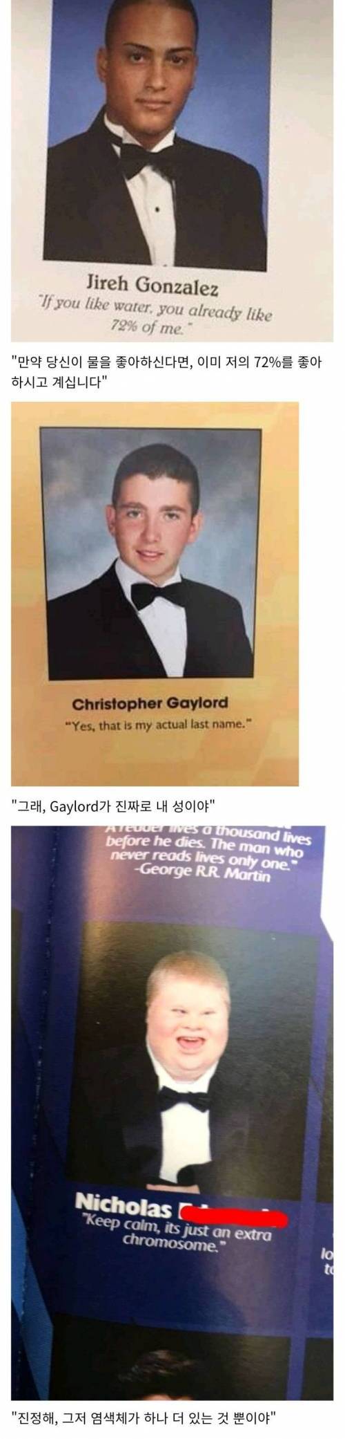 [스크랩] [기타]미국 고등학교 졸업생의 졸업앨범 멘트.jpg 작성자Rush B|작성시간24.01.30|조회수10,959 목록 댓글 22 글자크기 작게가 글자크기 크게가 다음검색 스크랩 원문 : 도탁스 (DOTAX) 현재 게시글 추가 기능 열기 북마크 공유하기 신고 센터로 신고 댓글 댓글 22 댓글쓰기 답글쓰기 댓글 리스트 작성자(본인 닉네임) 독터 스트레인지 | 작성시간 24.01.30 니그로는..성..바꿀수없어..? 작성자디리디리리라 | 작성시간 24.01.30 네그로씨 어떡해 ㅋㅋㅋㅋㅋㅋㅋㅋㅋㅋ 작성자나규인 | 작성시간 24.01.30 ㅋㅋㅋㅋㅋㅋㅋ 작성자SALOMON | 작성시간 24.01.30 게이로드 ㅅㅂ ㅠㅠㅠㅠㅠㅠ 작성자Given-Taken | 작성시간 24.01.30 ㅋㅋㅋㅋㅋㅋㅋㅋㅋㅋㅋㅋㅋㅋㅋㅋㅋㅋ미쳣다 댓글 전체보기