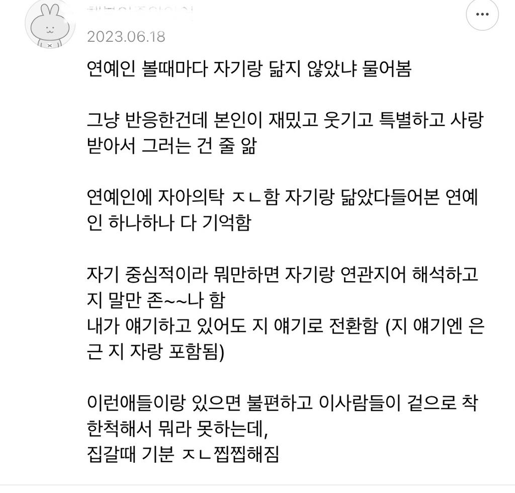 찐 자의식과잉은 자기객관화 안되고 자기가 븅인거 모르더라.. -