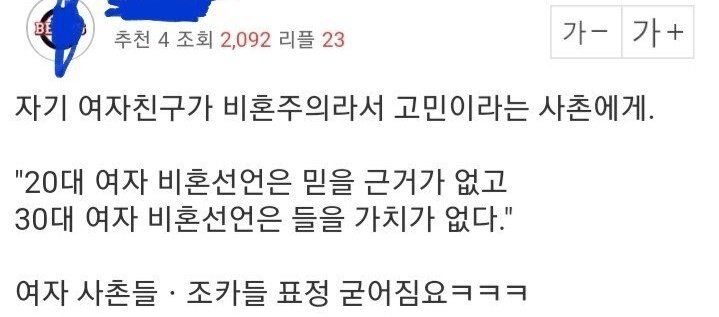 천년의 이상형이 나타나도 걔 밥차려줘야 하고 애 낳으면 당연히 걔 성씨를 줘야 하고 육아는 7할을 하고 '애 키워야 하는 여자'라는 짐을 져야 하는 가부장의 산물인 결혼을 거부하는 신념이라고.