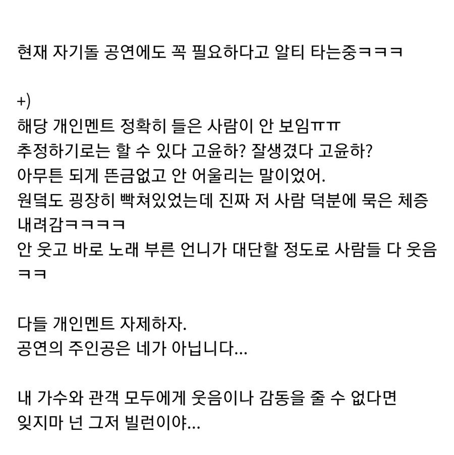 저 위에 짤은 윤하콘서트인데 윤하콘서트에 찐따남이 많아서 그런지 저런일 잦다고 하더라 (친구가 윤하 콘서트 몇년째 가는중)