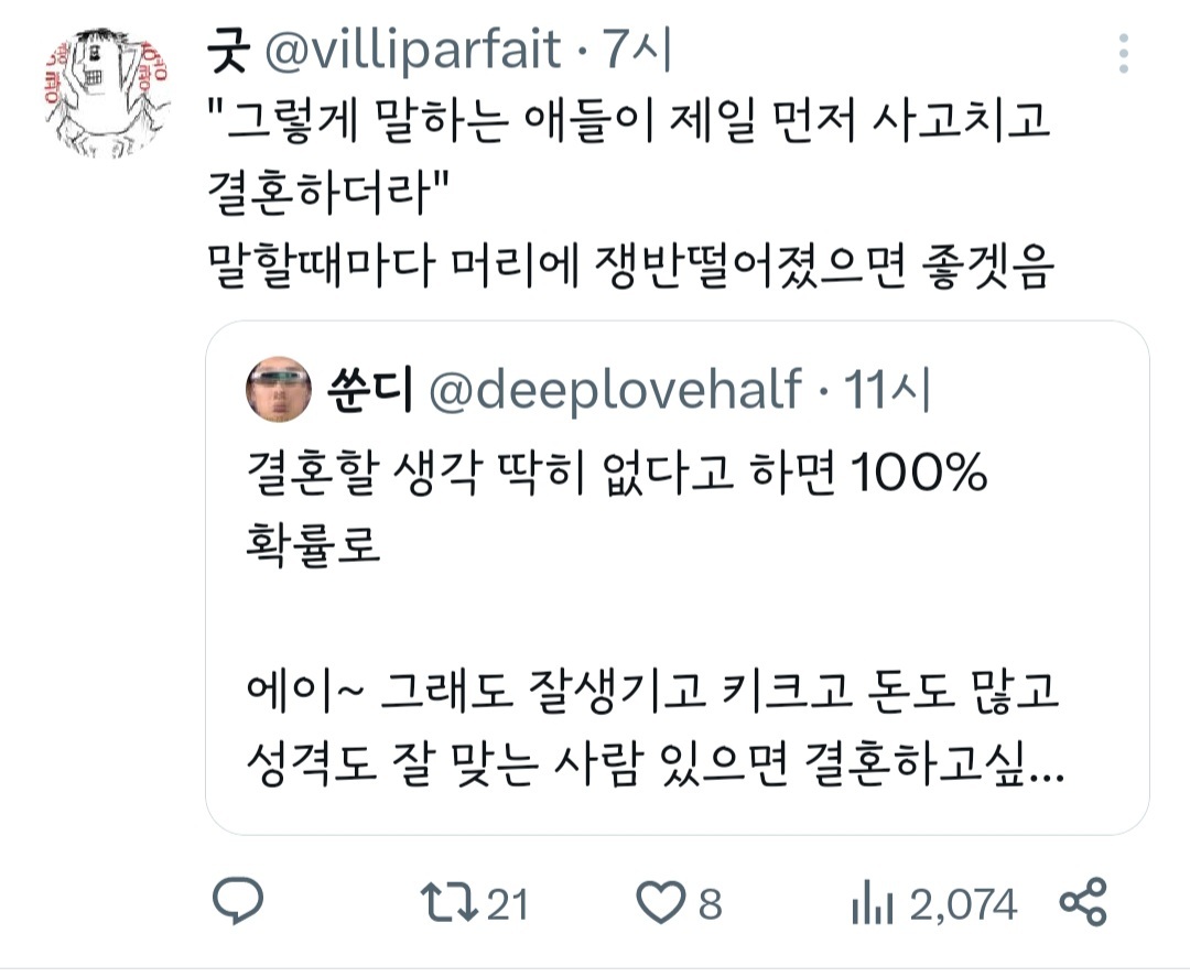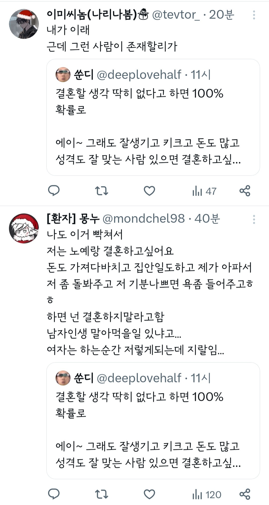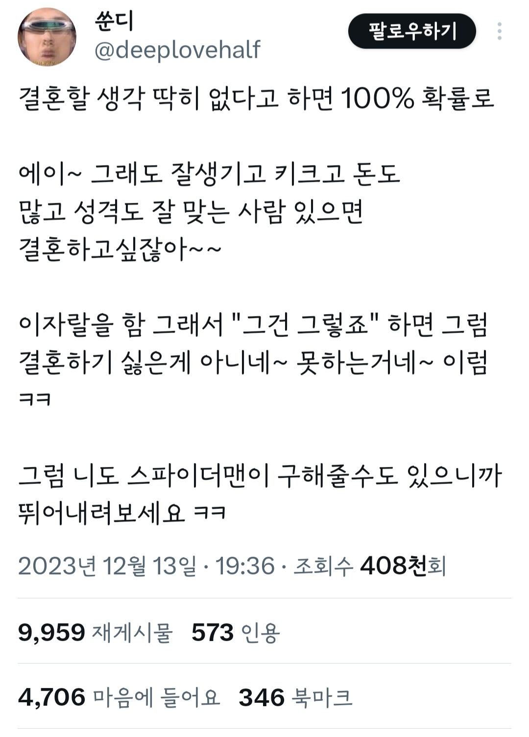 작성자sugarc0at 작성시간 24.02.06 근데 진짜 잘생기고 키크고 어쩌고 다 해도 결혼하기싫어....