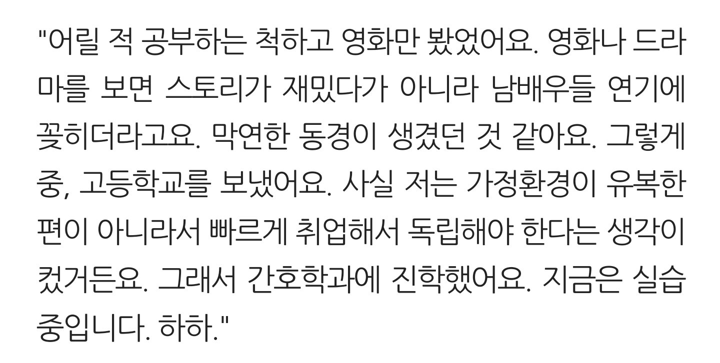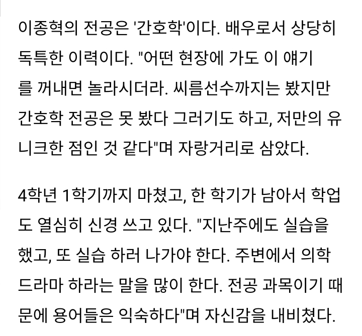 공부량도 많고 실습도 많아 힘들기로 유명한 간호과를 졸업까지한 남자 배우 처음봐서 가져옴