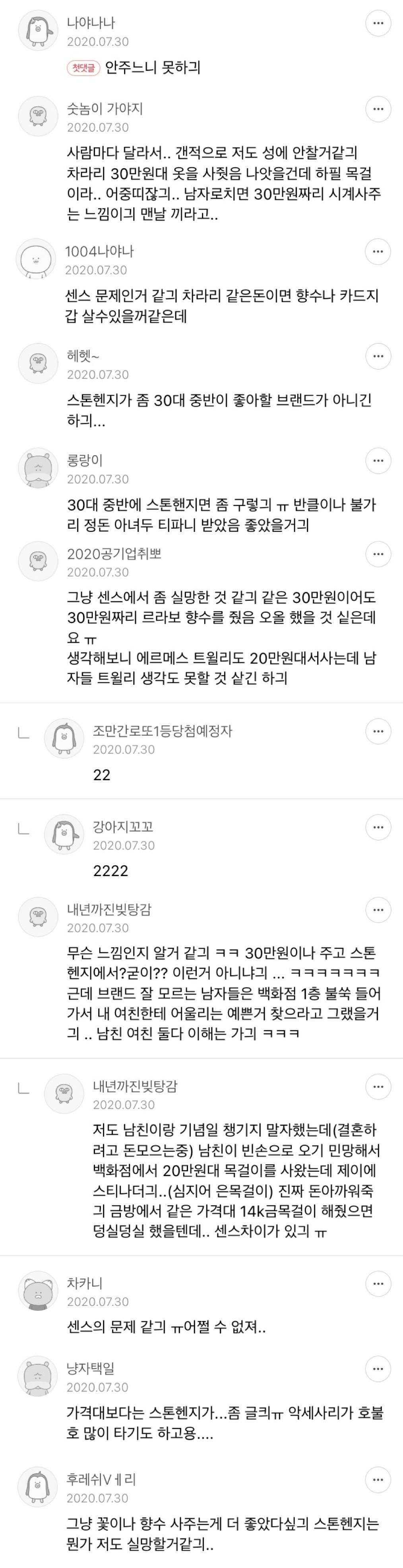 작성자강쥐작살 작성시간 24.02.08 아무래도 받는 사람 생각해서 사는게 선물이니까 ;; 금액이 아니라 성의 문제 같음 30만원으로 할수 있는 선물 많을텐데
