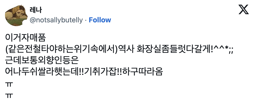 작성자라프라테오 작성시간 24.02.18 지하철 들어가기전에 나는 담배한대 피고 들어갈게 먼저 들어가 ~~~