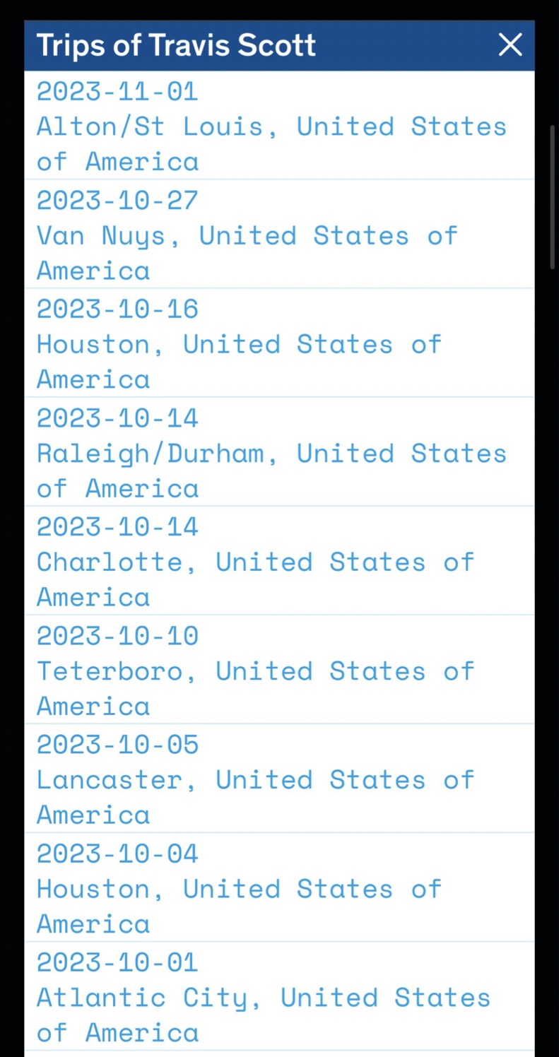 1위인 트래비스 스캇 비행 기록을 보면 이런 식으로 표시됨