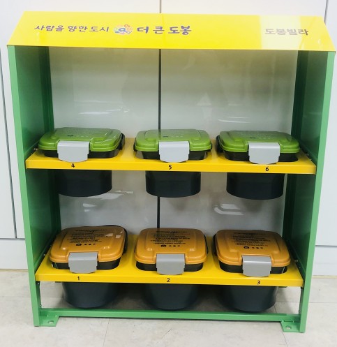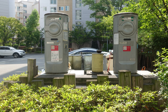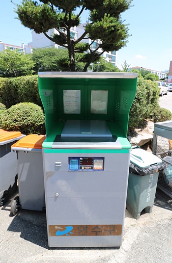 주민들은 봉투 대신 음식물 쓰레기 수거용 스티커를 돈 주고 사서, 이 통에 스티커를 붙이고 음식물을 담아서 내놓으면 됨.