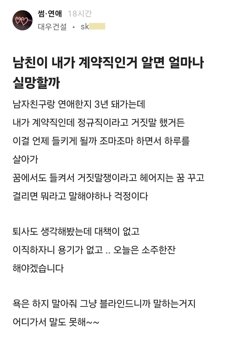 작성자이런꽃깥은 작성시간 24.02.18 그정도면 이직준비를하던지 정규직 갈 수 있는 준비를 해야지....백날 꿈만꾸고 스트레스만 받으면 뭐함 🥲 어차피 현실은 바뀌지않는데