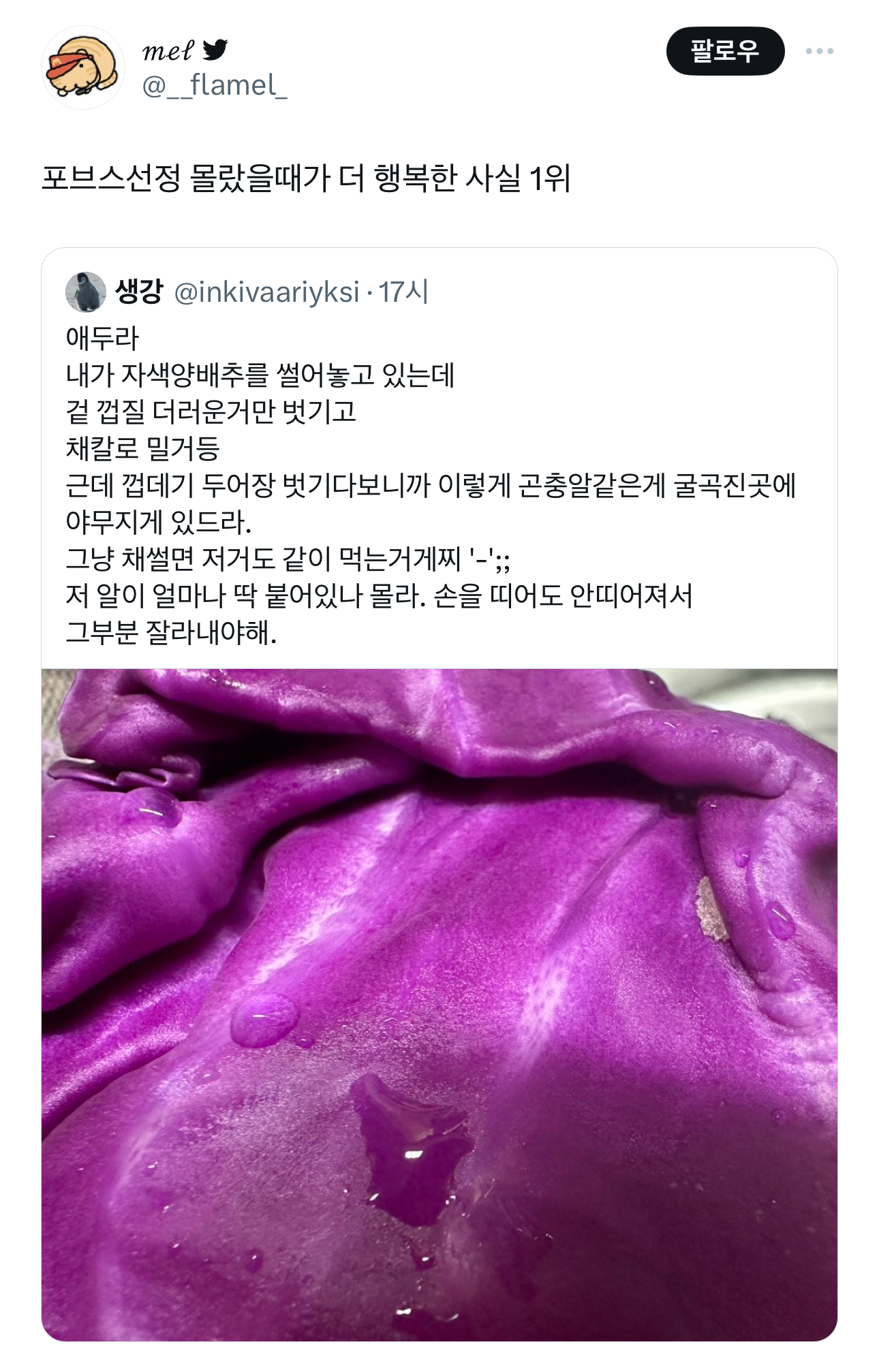 [흥미돋]포브스선정 몰랐을때가 더 행복한 사실 1위 작성자바나나스플릿구슬|작성시간24.02.21|조회수11,299 목록 댓글 23 글자크기 작게가 글자크기 크게가 출처 : https://x.com/__flamel_/status/1759926778720911552?s=46&t=v7QMmEln8v7WsADFKYn65gX의 𝓂ℯ𝓁 님(@__flamel_)포브스선정 몰랐을때가 더 행복한 사실 1위twitter.com 다음검색 현재 게시글 추가 기능 열기 북마크 공유하기 신고 센터로 신고 댓글 댓글 23 댓글쓰기 답글쓰기 댓글 리스트 작성자못된장모와와햄 | 작성시간 24.02.21 불에 익혀 먹어야게따 작성자옴하옴하각~ | 작성시간 24.02.21 움~ 고소해 작성자탑뇽 | 작성시간 24.02.21 염염긋 작성자댓글 | 작성시간 24.02.21 모르고 먹으면 노상관 작성자은평구용의숨결 | 작성시간 24.02.22 머리 깡!!!!! 이제 잊었음 댓글 전체보기