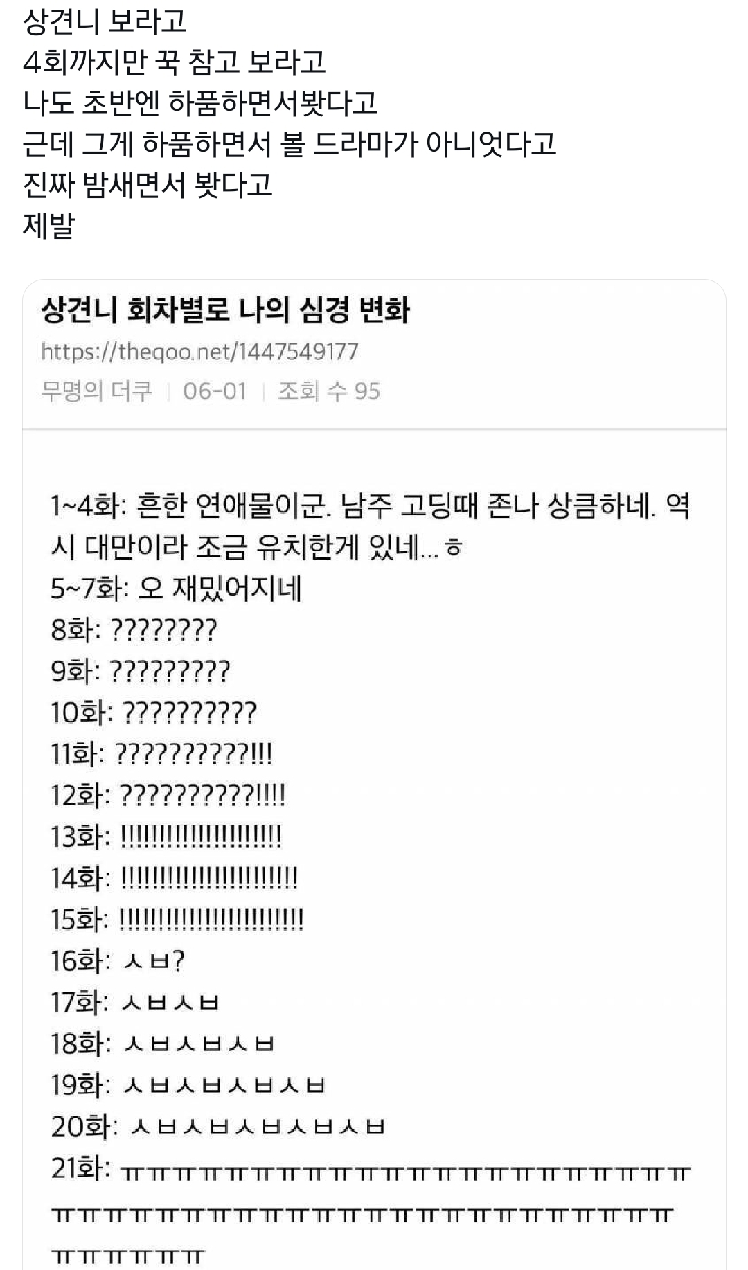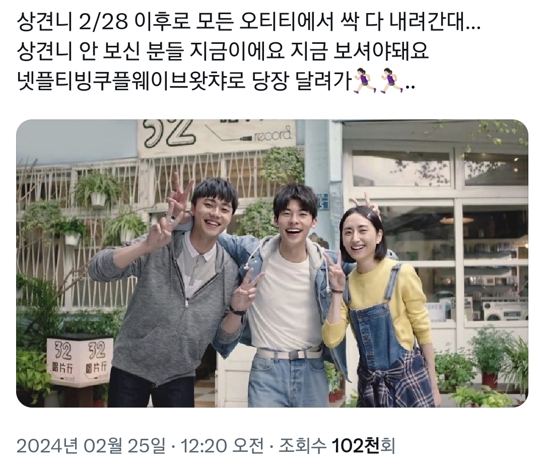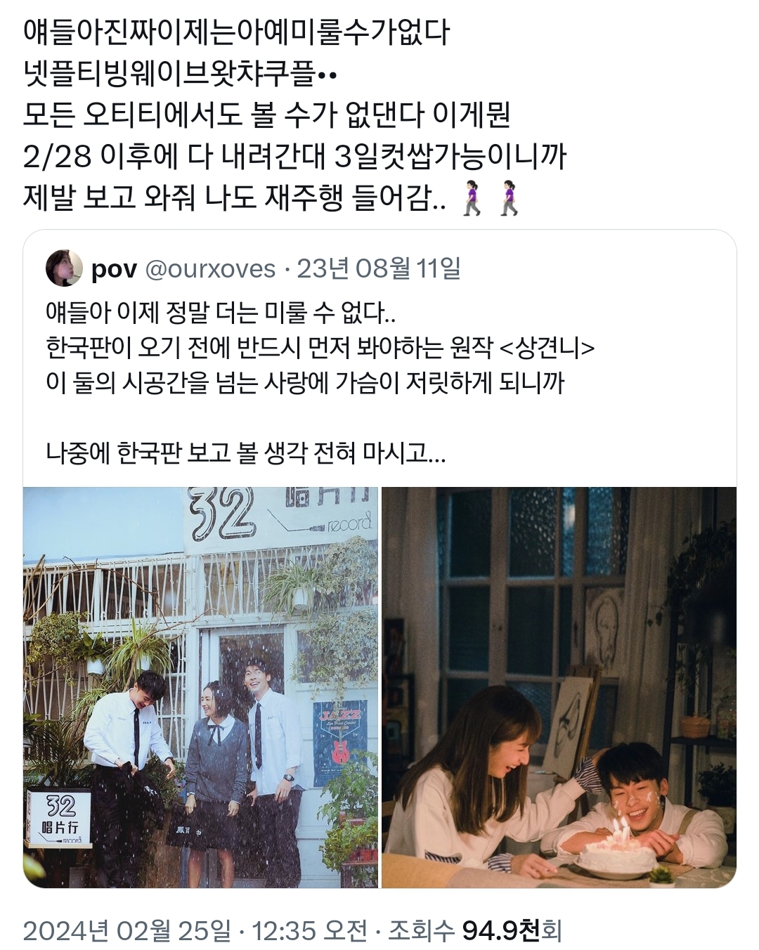 [흥미돋]2/28 이후 국내 모든 OTT에서 내려간다는 대만드라마 <상견니>.twt 작성자아마레티|작성시간24.02.25|조회수9,907 목록 댓글 76 글자크기 작게가 글자크기 크게가 출처 : 여성시대 아마레티왓챠도 종료 공지됨같은 날 국내에서 종료되는 거 보니까단순히 각 ott별로 계약이 끝난 게 아니라국내 판권 계약이 끝난 듯(+) 초반에 하차한 여시들 참고 봐봐..ㄹㅇ 이거임 다음검색 현재 게시글 추가 기능 열기 북마크 공유하기 신고 센터로 신고 댓글 댓글 76 댓글쓰기 답글쓰기 댓글 리스트 작성자척척고졸 | 작성시간 24.03.07 나지금 연어옴 ㅁㅊ나 씨발.. 작성자구름입니다 | 작성시간 24.03.09 뭐라고 이걸 지금 보다니 작성자둥글게둥글게 짝! | 작성시간 24.03.26 나 이거 중간까지 봤는데 내려갔어 ㅠㅠ 작성자고구마춘식이 | 작성시간 24.04.07 아씨핥돌려줘요 작성자티모시 샤르르르 샤랄랄라 샬라메 | 작성시간 24.04.15 이 글을 지금 받더요 ㄷ ㄷ 작년에 볼 걸,,,,, 시크릿으로 끌어당김한다 기다려라 댓글 전체보기