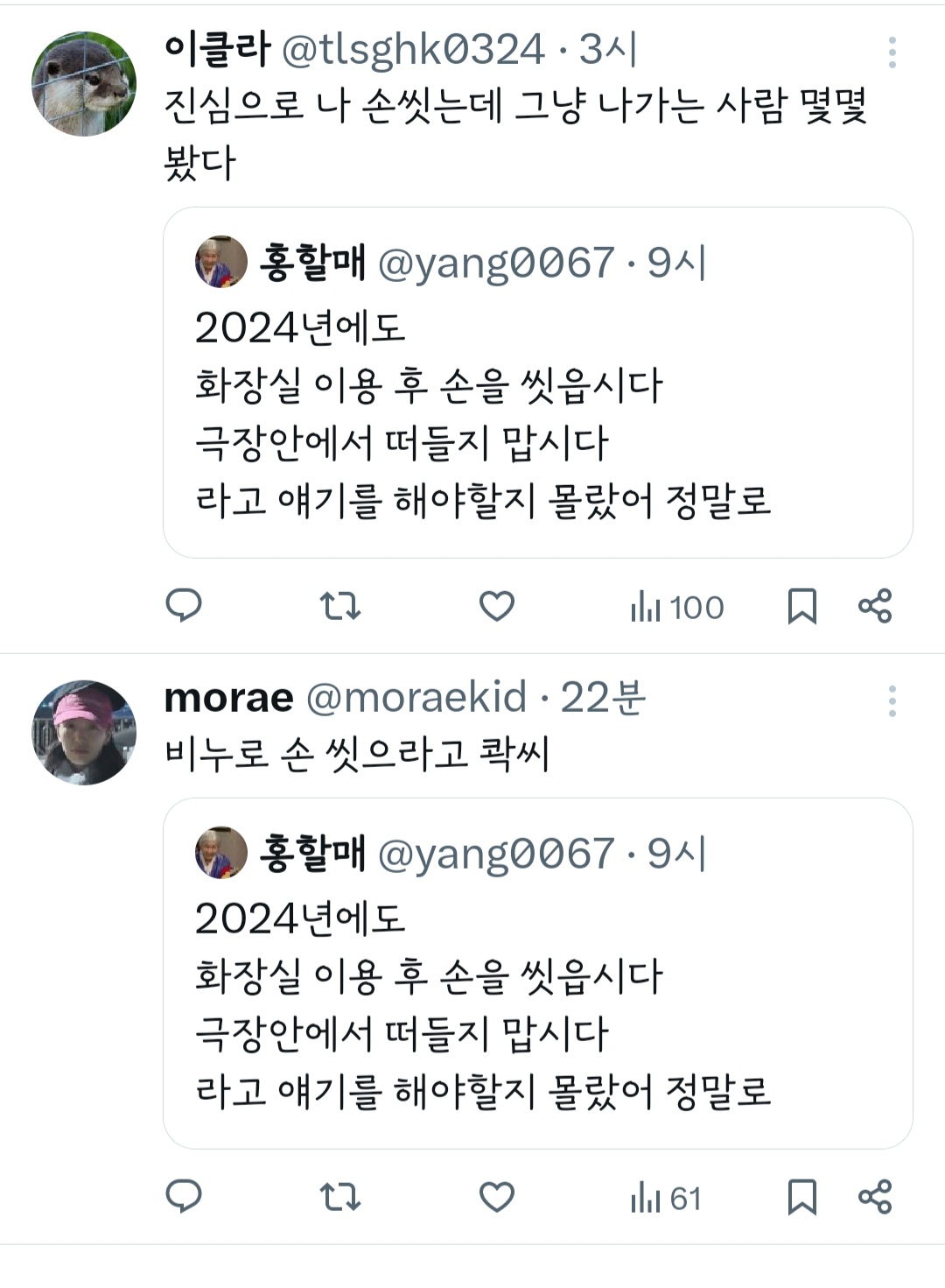 작성자머띿우 머락우 작성시간 24.02.27 화장실 갔다가 손 안씻는 사람들 진짜 존나많아^^...안 드러운가 그 손에 온갖 오물입자가 다 묻어있을텐데