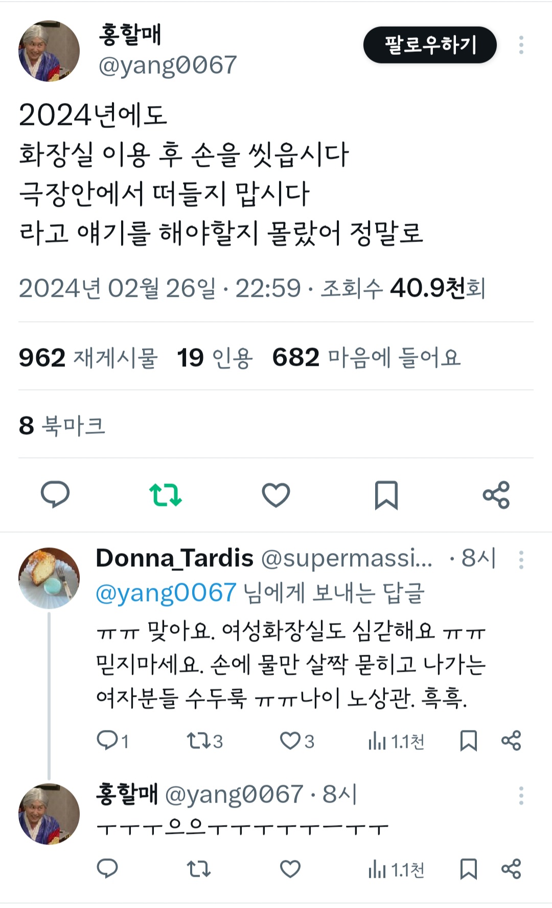 작성자설탕안먹어 작성시간 24.02.27 맞아...... 손 안씻는 사람 존나 많아.....회사 진짜 환멸남🥲