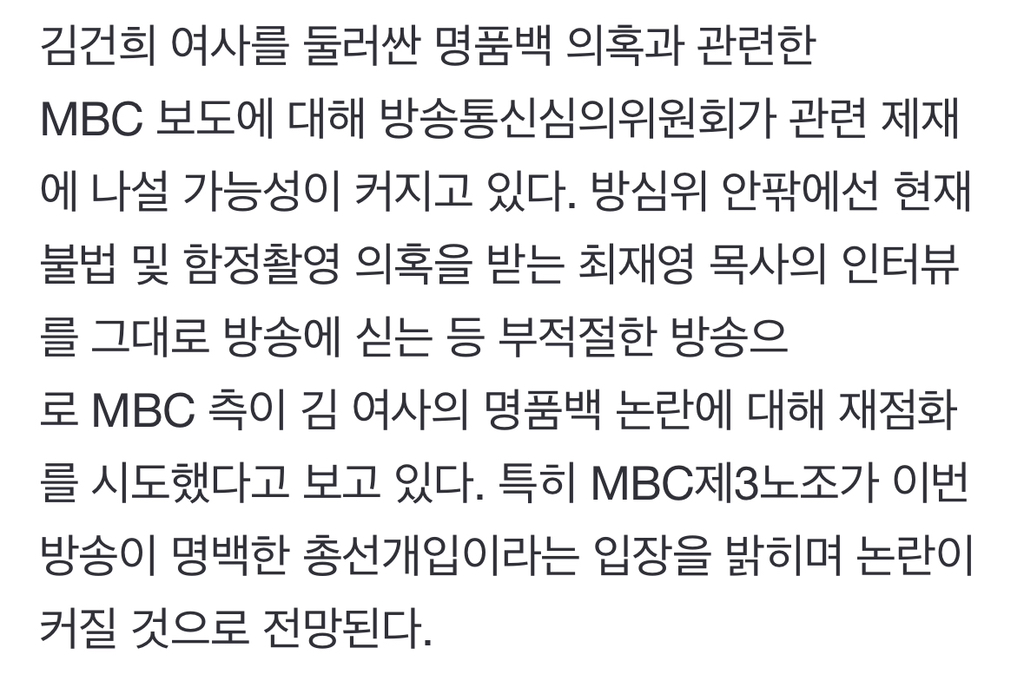 [여시뉴스데스크]이번엔 ‘김건희 여사 명품백’ 보도?… 선방위 심의 나서나 작성자소리앙|작성시간24.02.27|조회수593 목록 댓글 5 글자크기 작게가 글자크기 크게가 출처 : https://naver.me/GEIPk7Rj이번엔 ‘김건희 여사 명품백’ 보도?… 선방위 심의 나서나방심위 관계자 “3월 초중순쯤 ‘MBC 스트레이트’ 심의 진행될 것” 김건희 여사를 둘러싼 명품백 의혹과 관련한 MBC 보도에 대해 방송통신심의위원회가 관련 제재에 나설 가능성이 커지고 있다n.news.naver.com전문출처 다음검색 현재 게시글 추가 기능 열기 북마크 공유하기 신고 센터로 신고 댓글 댓글 5 댓글쓰기 답글쓰기 댓글 리스트 작성자샤인머스켓켓 | 작성시간 24.02.27 제정신이아니구만 독재국가 만들었네. 그럼 뭐하냐고 유튜브는 어케 막을라고 삭제된 댓글입니다. 답댓글 작성자소리앙 작성자 본인 여부 작성자 | 작성시간 24.02.27 김건희의디올빽 수정했어 고마워!! 작성자프로폴리스도경찰이다 | 작성시간 24.02.27 윤석열 독재국가네 여기가 북한이냐? 작성자라피유벨 | 작성시간 24.02.27 ;; 댓글 전체보기