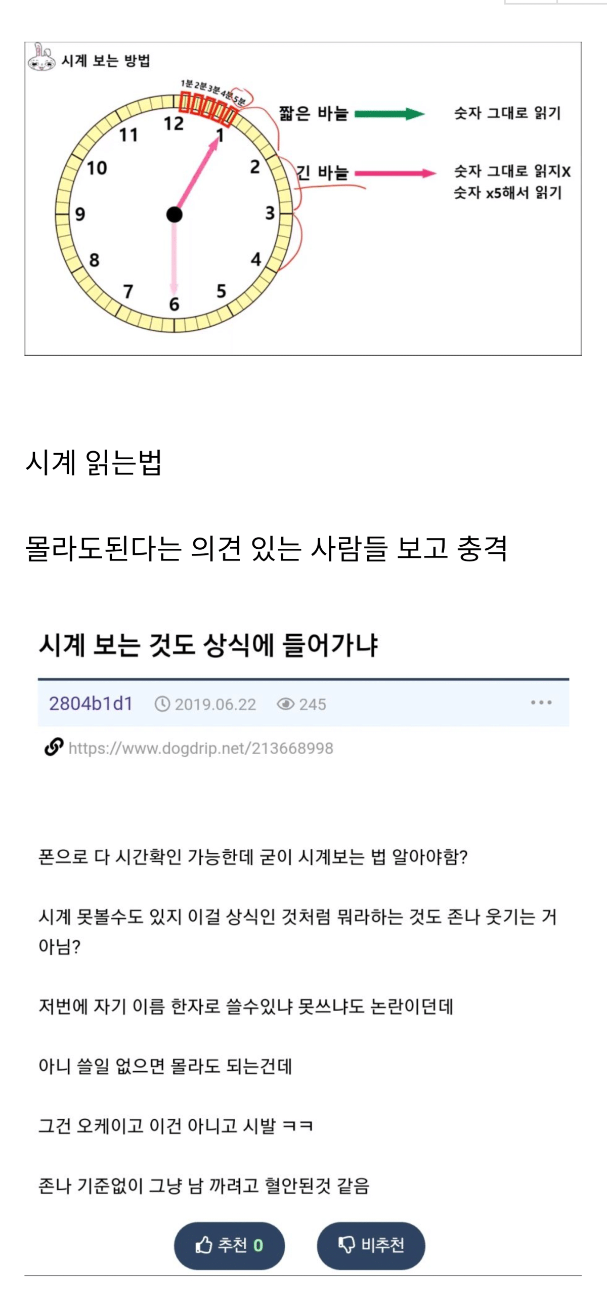 [기타]상식 논란 중 하나인 시계 보는 법 작성자siqlo - One Way Street|작성시간24.02.27|조회수5,815 목록 댓글 51 글자크기 작게가 글자크기 크게가 출처 : https://m.cafe.daum.net/dotax/Elgq/3632822?svc=cafeapp논란이여서 충격이였던 상식.jpg m.cafe.daum.net 다음검색 현재 게시글 추가 기능 열기 북마크 공유하기 신고 센터로 신고 댓글 댓글 51 댓글쓰기 답글쓰기 댓글 리스트 작성자저기여 | 작성시간 24.02.27 초등학교에서 안배움? 작성자아우추워라 | 작성시간 24.02.27 초등학교 교육과정에 있구만 당연히알아야지 .. 작성자나우앤이지 | 작성시간 24.02.27 어디까지 모를래 작성자냥르장머리 | 작성시간 24.02.27 실제로 한 남중은 애들이 시계를 읽지못해 디지털시계로 바꿈 예산 낭비되니까 공부해라 색히덜아 작성자여성의취업파트너 | 작성시간 24.02.27 도대체 언제까지 뭐 얼마나 모를건데 댓글 전체보기