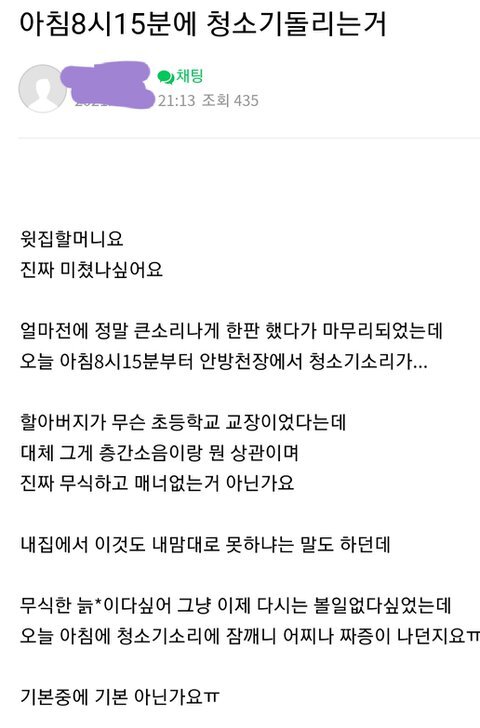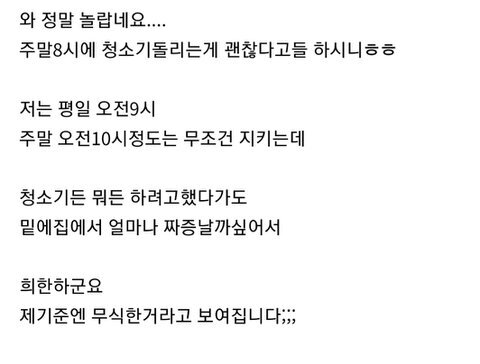 [기타]주말아침8시에 청소기 돌리지마세요 작성자siqlo - One Way Street|작성시간24.02.27|조회수18,587 목록 댓글 175 글자크기 작게가 글자크기 크게가 출처 : https://m.cafe.daum.net/subdued20club/ReHf/3486077?svc=cafeapp맘카페 청소기 논란 출처 : https://m.pann.nate.com/talk/362731644?currMenu=talkerorder=RANrankingType=totalpage=2맘카페 욕먹고 튄썰무식하게 아침8시에 청소기 돌린다고 욕하다가.댓글들이 편 안들어 주니 글삭함.ㅋ 여러분들 생각은m.cafe.daum.net 다음검색 현재 게시글 추가 기능 열기 북마크 공유하기 신고 센터로 신고 댓글 댓글 175 댓글쓰기 답글쓰기 댓글 리스트 작성자왼손으로그린별하나 | 작성시간 24.02.28 한시간 내내 돌리시나? 작성자하겐ㄷr즈 | 작성시간 24.02.28 남한테 지랄하지말고 니가 전원주택 사세요 작성자마카핑 | 작성시간 24.02.28 저런 글쓰는 마음 가짐이면 9시에 했어도 글 썼을 것 같은데 그냥 주택 사는게 나을 듯 작성자닉넴을 초기화 .. | 작성시간 24.02.29 말투가 왜 저래 ; 작성자존버만이답이다 | 작성시간 24.03.01 8시면 괜찮지 않나..새벽도 아니고; 댓글 전체보기