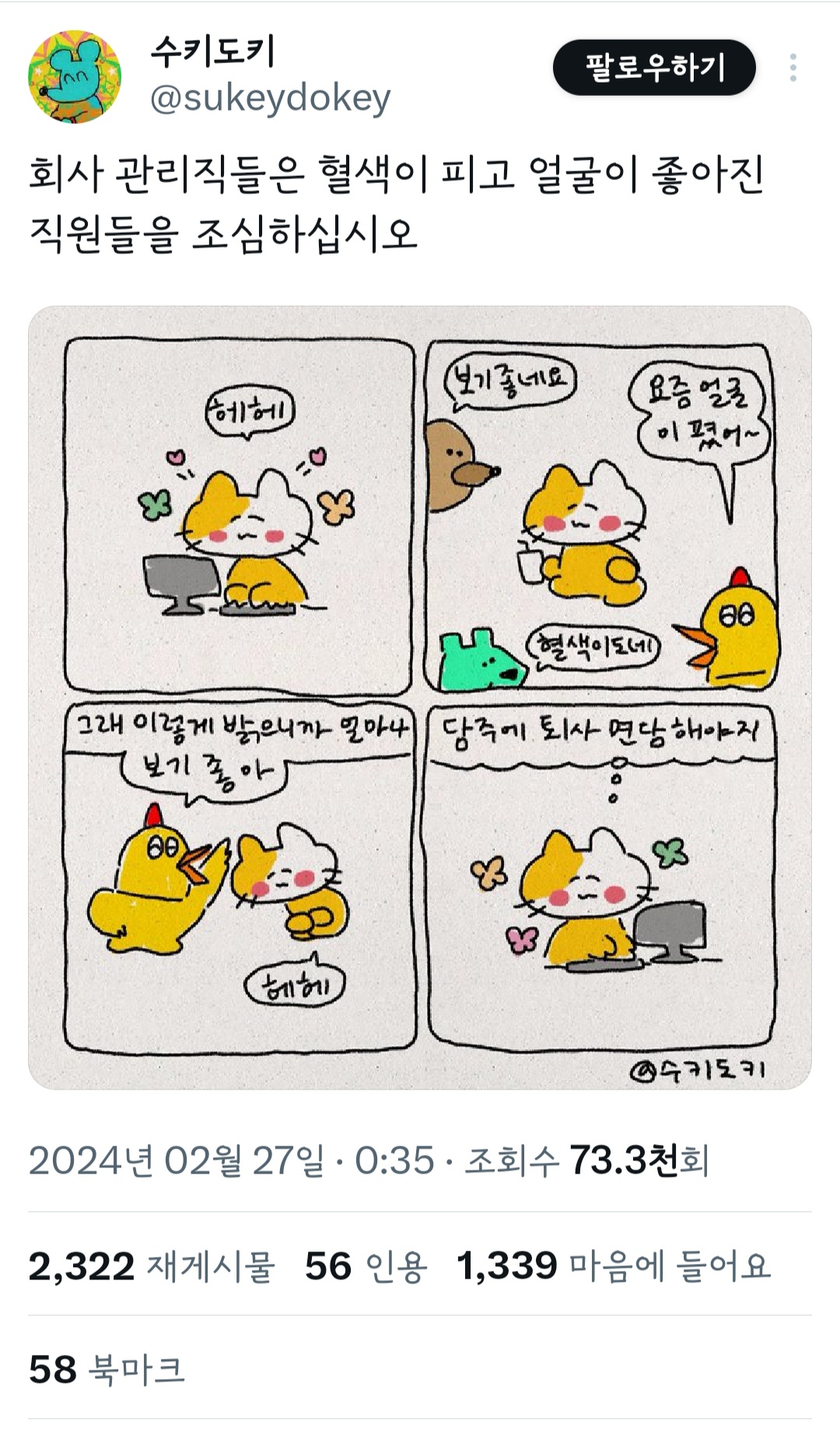 작성자행동파 돼지 작성시간 24.02.27 ㅋㅋㅋㅋ 아 퇴사하고 싶다 이게 아니라 퇴사하기로 아예 맘 먹었으면 은근하게 평온해보임 ㅋㅋㅋㅋㅋ