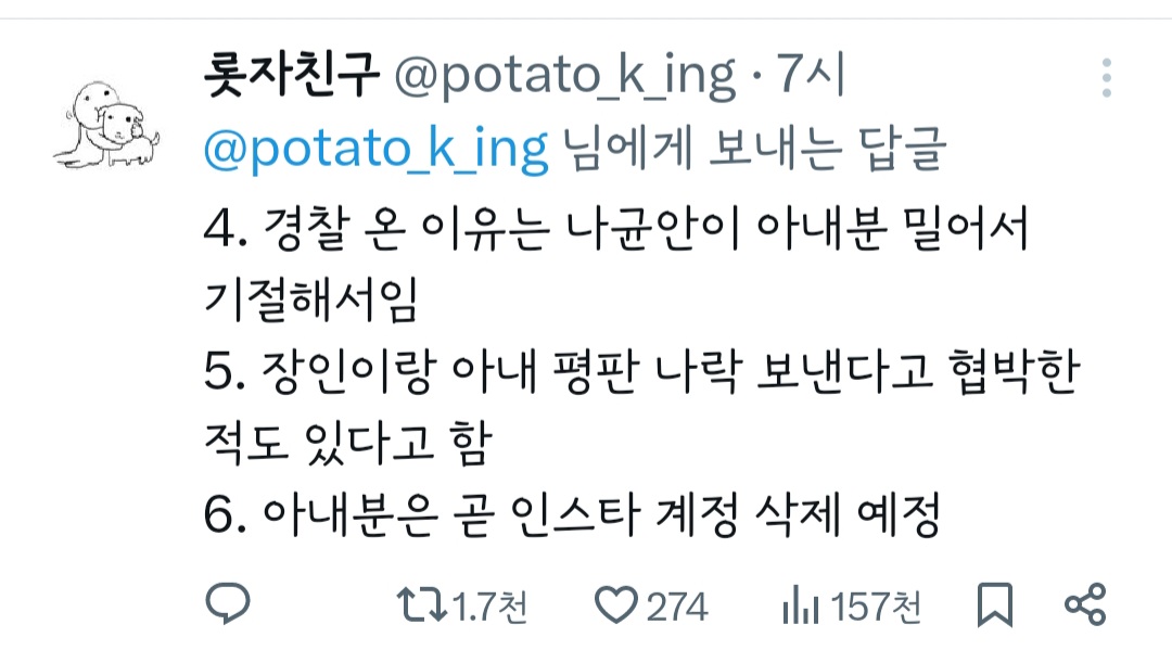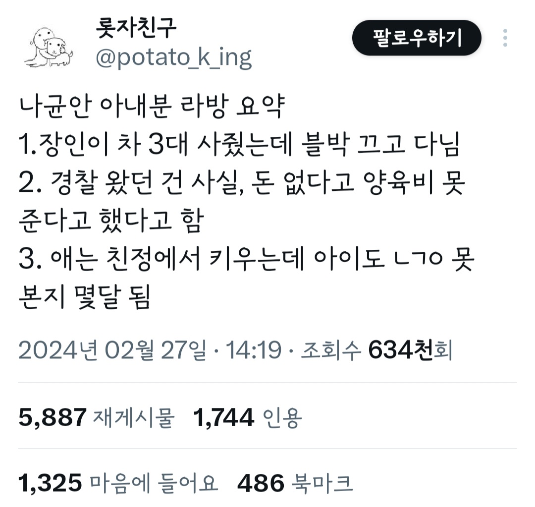 [기타]나균안 아내분 라방 요약 작성자서지혜.|작성시간24.02.27|조회수22,406 목록 댓글 24 글자크기 작게가 글자크기 크게가 출처 : https://twitter.com/potato_k_ing/status/1762346659953143917?t=wVPJP6R_qDxQukl0_B4IKg&s=19 다음검색 현재 게시글 추가 기능 열기 북마크 공유하기 신고 센터로 신고 댓글 댓글 24 댓글쓰기 답글쓰기 댓글 리스트 작성자은한 | 작성시간 24.02.27 이미친새끼가 공 좀 던진다고 응원했는데 하 나가라 나가 작성자무해지수 | 작성시간 24.02.28 뭐이런 쓰레기가 다 있어..!? 작성자머리숱1/3만없어져라 | 작성시간 24.02.28 은혜도 모르는새끼 쓰레기새끼 작성자쿵딱치 | 작성시간 24.02.28 역시 그 성별 역시 그 직업 작성자원투쓱빡원투 | 작성시간 24.02.28 돈이 왜 없어 월급 꼬박꼬박 받으면서ㅡㅡ 양육비 내놔 댓글 전체보기