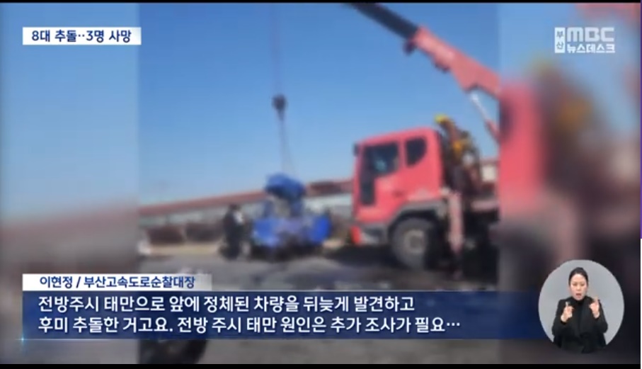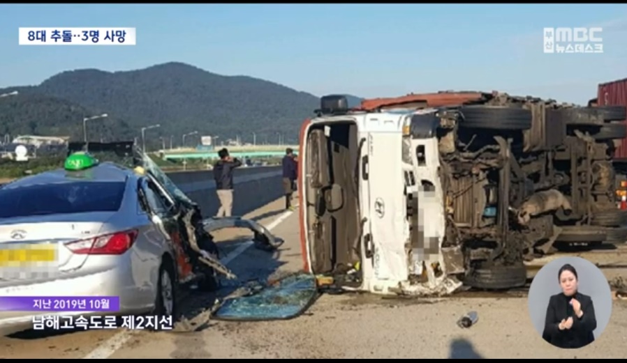출근길 남해고속도로 나들목 정체구간에서 대형 화물차가 서행중이던 승용차 셋을 뒤에서 강하게 들이받은 사고