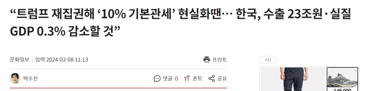 -안덕근 산업통상자원부 장관 주재 피셜 " 트럼프 재집권해 기본관세 현실화땐 , 한국 실질 GDP 0.3% 감소 "