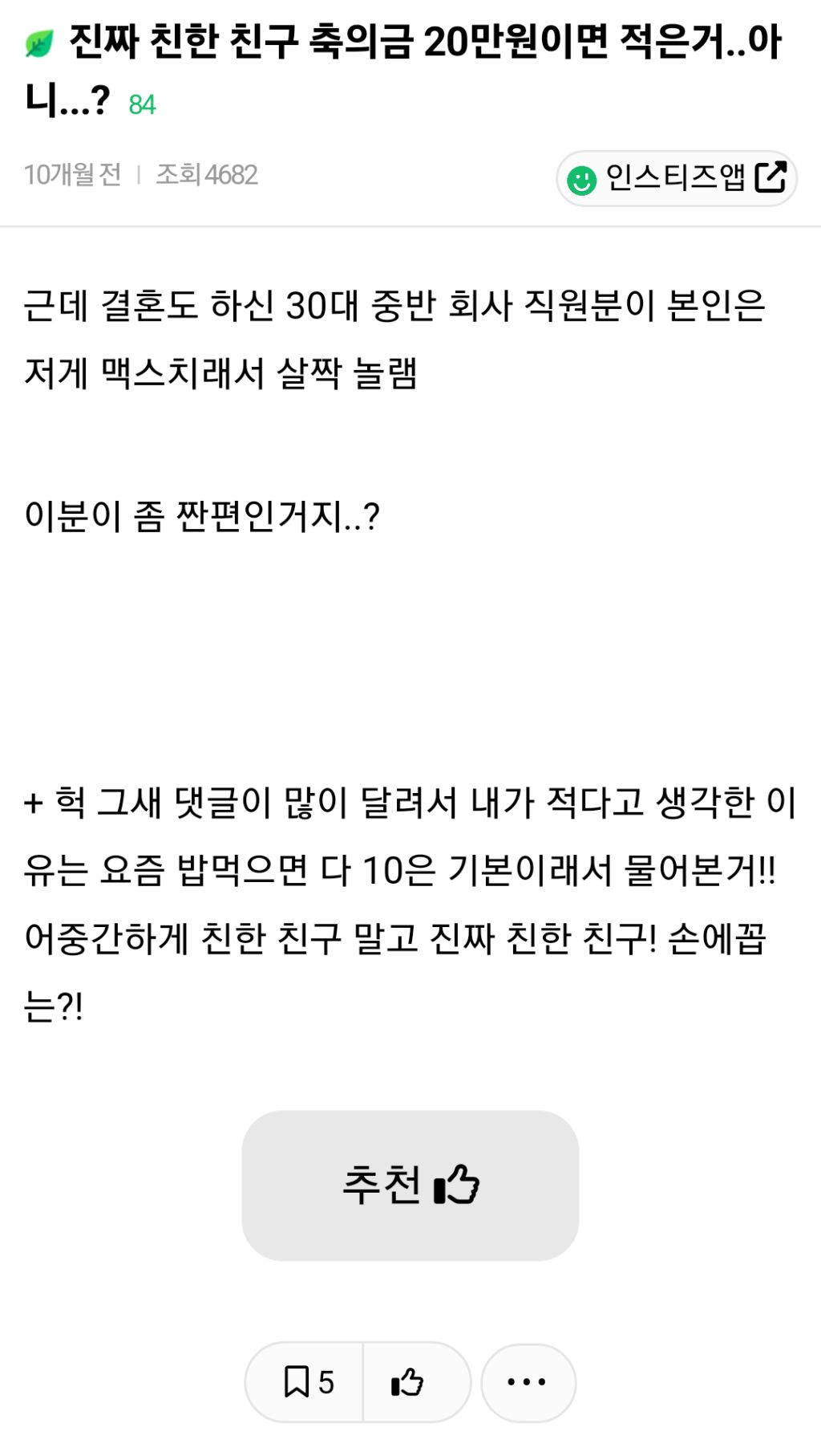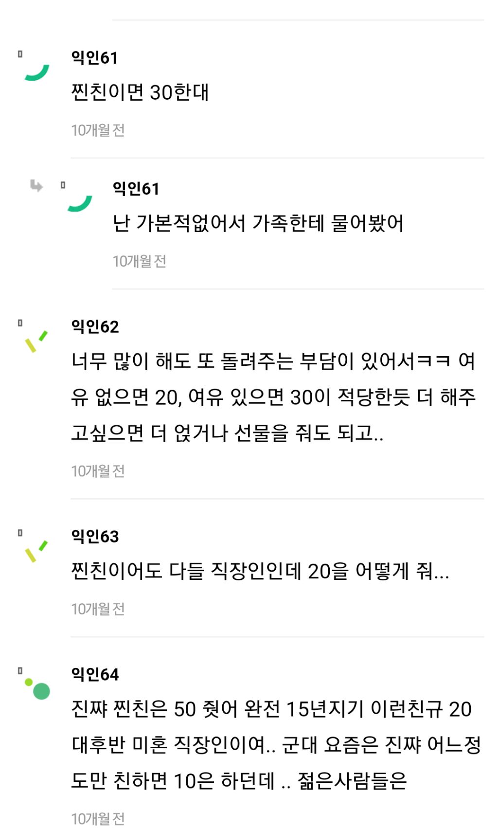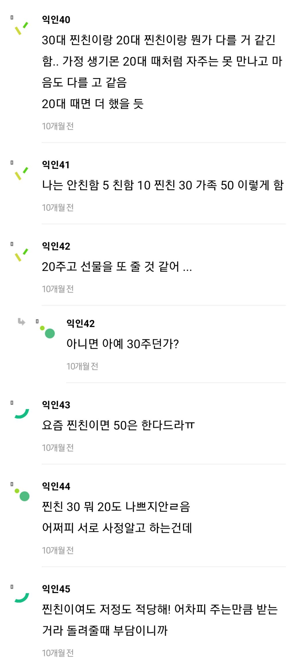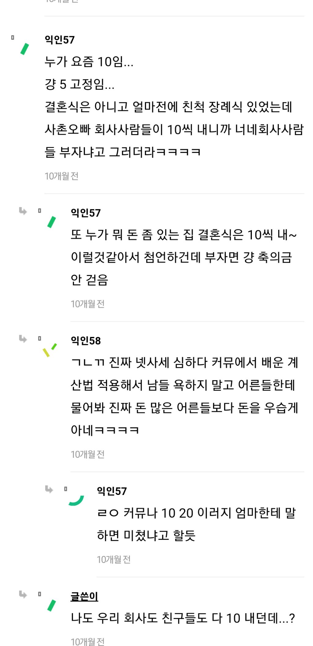 작성자hm_son 작성시간 24.03.08 내 주변만 그런가 다들 50이상씩 하길래 놀램.... 나는 진짜 대학 찔친들도 진짜 많이 줘봤자 30이 최대..ㅠ