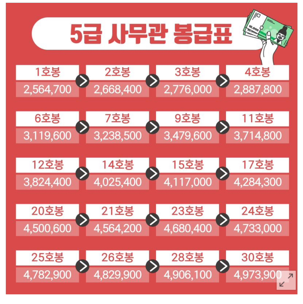 2021년 인사혁신처가 공개한 5급 공무원 월급인데 이건 기본급이고 수당이 더 붙는다고함 자세한건 글쓴사람도 모르기때문에... 능력에비해 적다라는것만 알면 되겠습니다