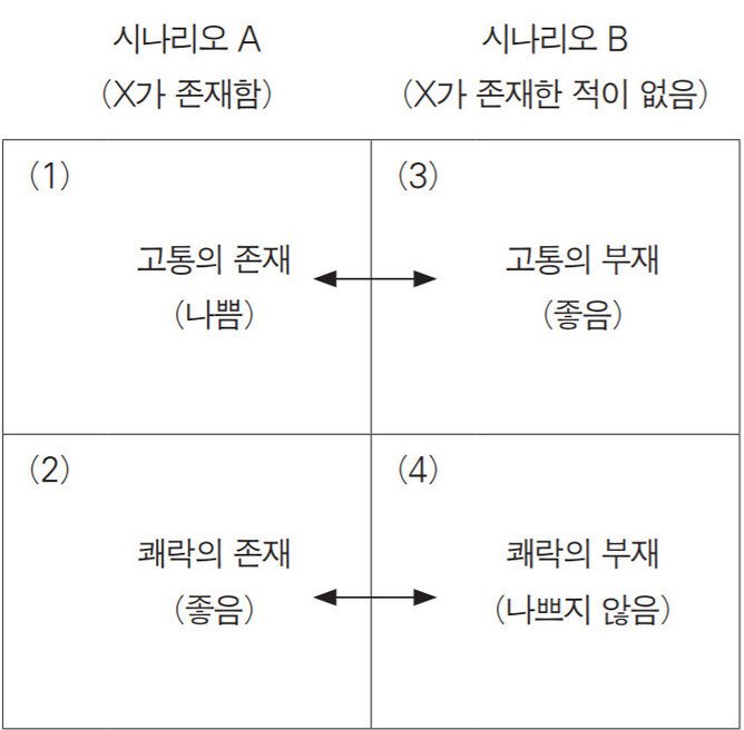 쾌락이 고통을 상쇄할수 있지 않냐고 주장할수 있겠지만, 고통이 쾌락보다 더 큰건 당연함. 막말로 아무리 많은 돈과 명예와 행복한 생활을 하고 있었던 사람도 어느 한순간 불의의 사고로 죽는다면, 그런 행복들은 더 이상 누릴수 없으니까.