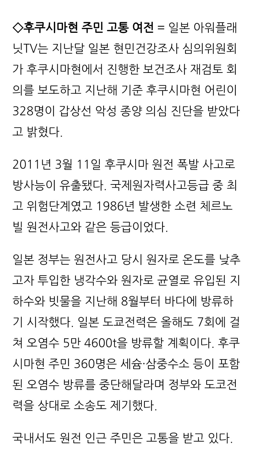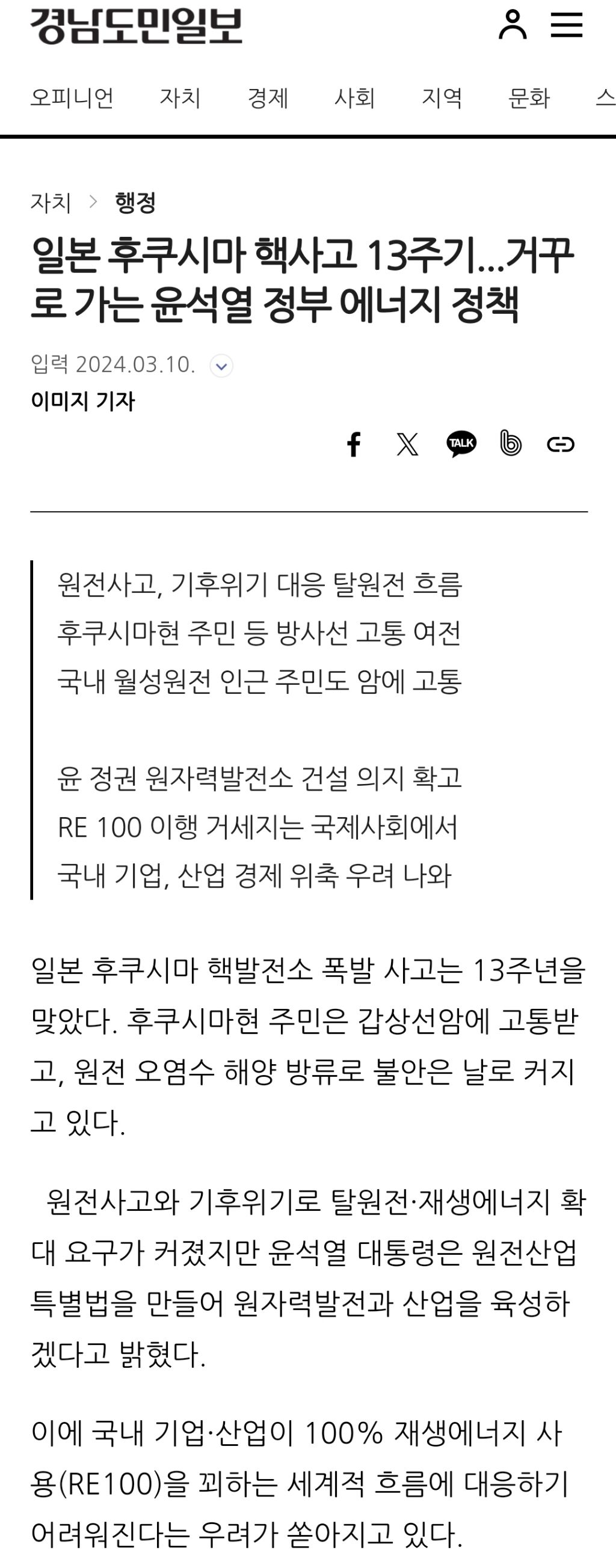 [여시뉴스데스크]일본 후쿠시마 핵사고 13주기...거꾸로 가는 윤석열 정부 에너지 정책 작성자천리길|작성시간24.03.10|조회수351 목록 댓글 0 글자크기 작게가 글자크기 크게가 출처: https://www.idomin.com/news/articleView.html?idxno=905849일본 후쿠시마 핵사고 13주기...거꾸로 가는 윤석열 정부 에너지 정책일본 후쿠시마 핵발전소 폭발 사고는 13주년을 맞았다. 후쿠시마현 주민은 갑상선암에 고통받고, 원전 오염수 해양 방류로 불안은 날로 커지고 있다. 원전사고와 기후위기로 탈원전·재생에너지www.idomin.com이하 생략전문 출처로 다음검색 현재 게시글 추가 기능 열기 북마크 공유하기 신고 센터로 신고 댓글 댓글 0 댓글쓰기 답글쓰기 댓글 리스트