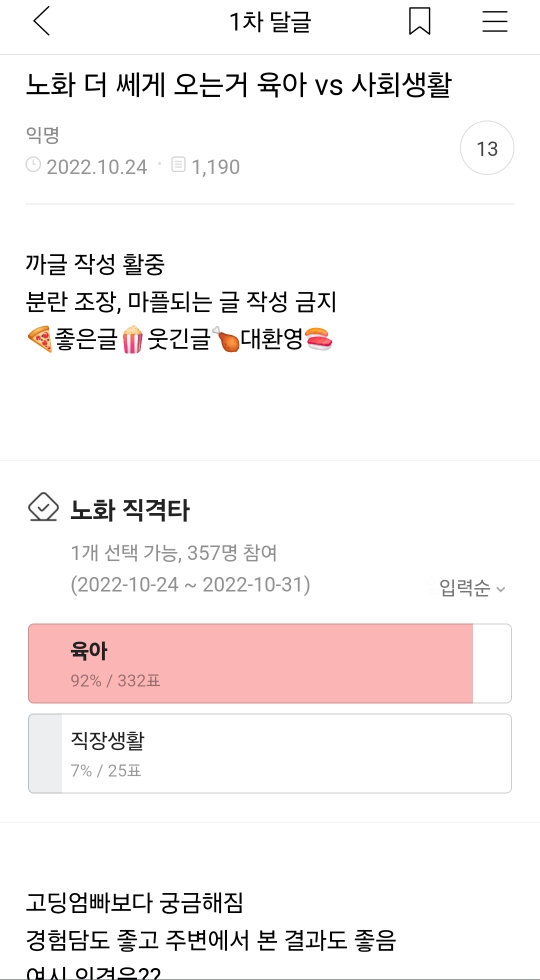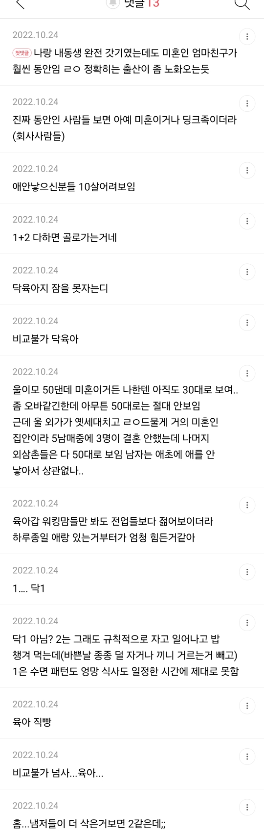 [스크랩] [흥미돋]노화 더 쎄게 오는거 육아 vs 사회생활 작성자흲둥|작성시간24.03.10|조회수5,618 목록 댓글 59 글자크기 작게가 글자크기 크게가 출처 : https://m.cafe.daum.net/subdued20club/WFYL/917800 다음검색 스크랩 원문 : *여성시대* 차분한 20대들의 알흠다운 공간 현재 게시글 추가 기능 열기 북마크 공유하기 신고 센터로 신고 댓글 댓글 59 댓글쓰기 답글쓰기 댓글 리스트 작성자에리 가고 메리 옴 | 작성시간 24.03.10 당연히 육아지.. 출산 자체가 노화 시작임 작성자편안한재즈 | 작성시간 24.03.10 닥 육아지 일단 임신부터가 몸 망가지는데 작성자꼬북칩에인삼주 | 작성시간 24.03.10 이걸 투표한다고????? 작성자닥코약기 | 작성시간 24.03.11 동안인 사람중에 비혼이거나 애안낳은 여자분들 많은걸로보아.. 닥 임출육 작성자Lovewins | 작성시간 24.03.14 육아 ! 댓글 전체보기