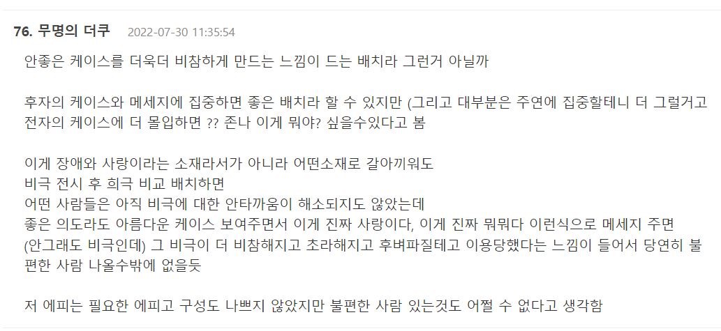 잘 만든 드라마 맞고 저 부분도 좋은 해석도 많겠지 근데 나는 집중이 안되더라 -
