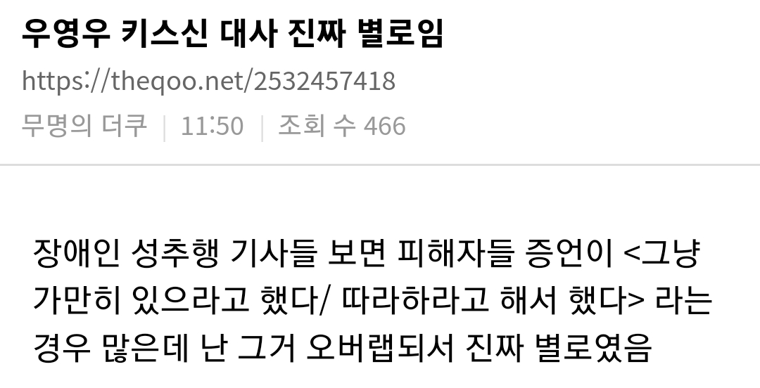 지적장애인 성폭력 피해자(실화 사건 배경)와 피의자 실형 선고 뒤 주인공 우영우의 키스신이 나왔는데