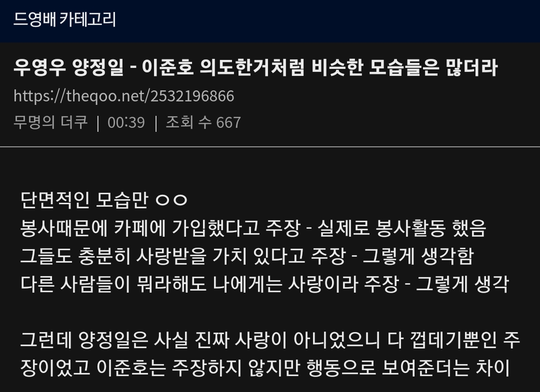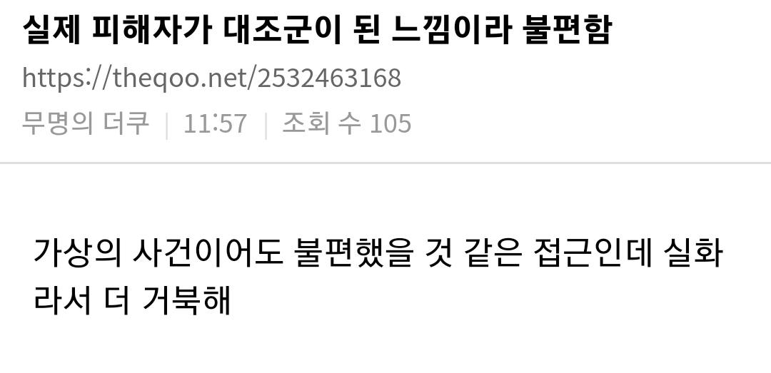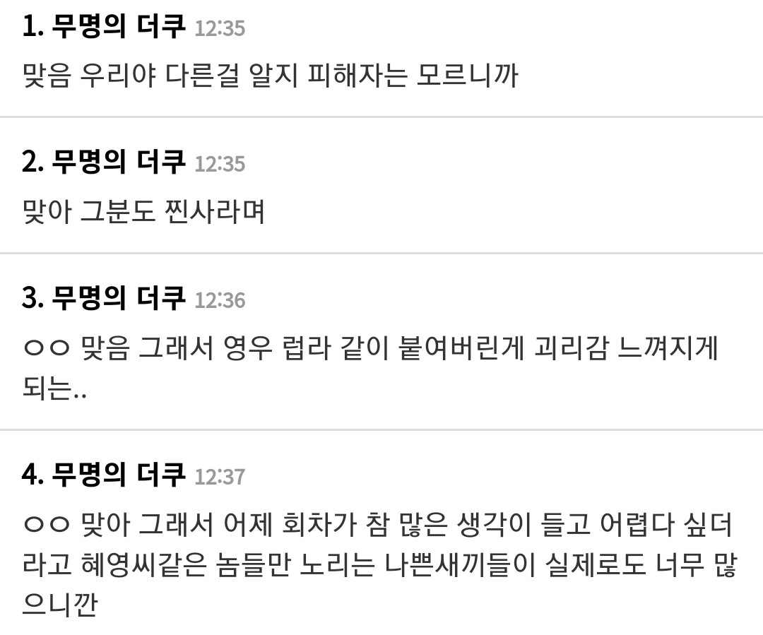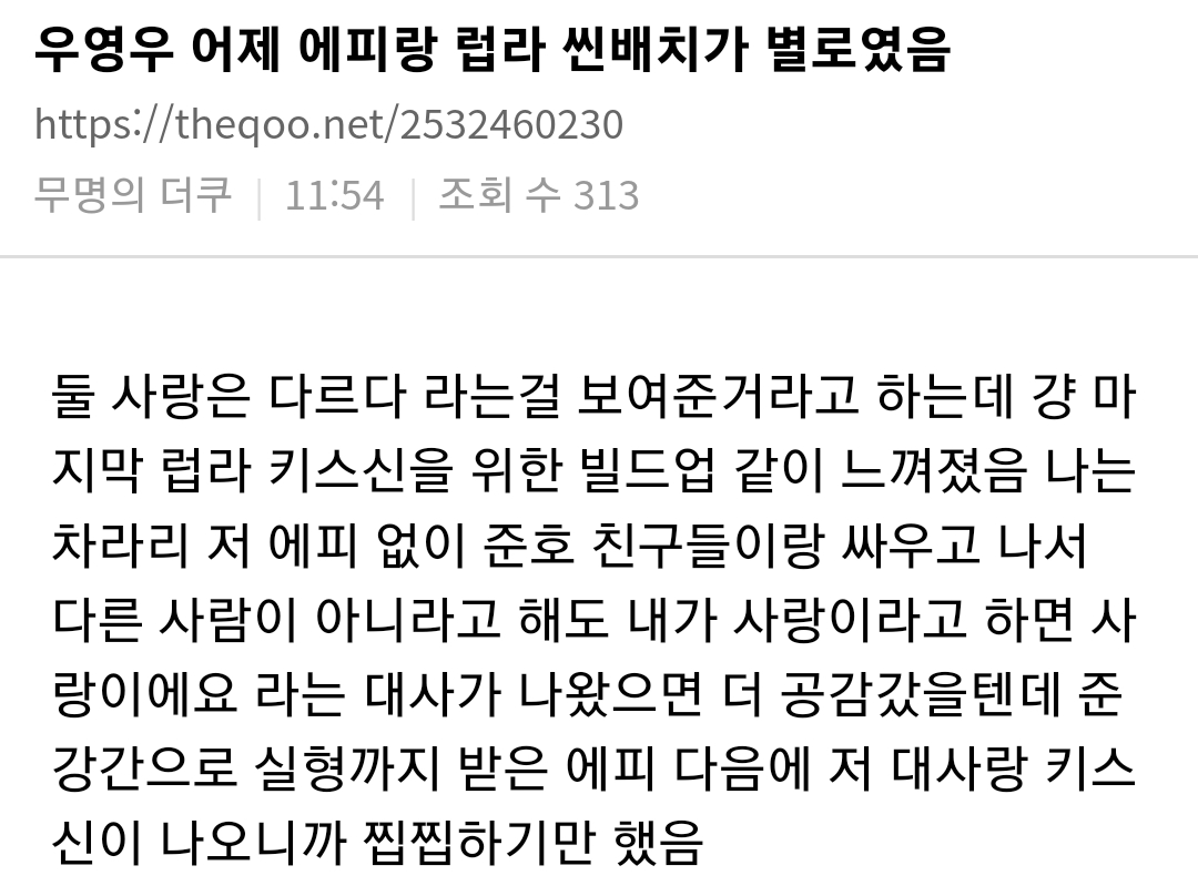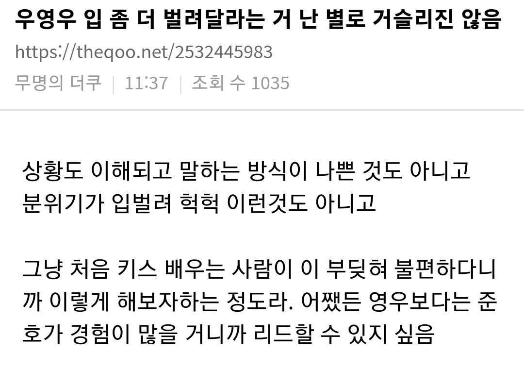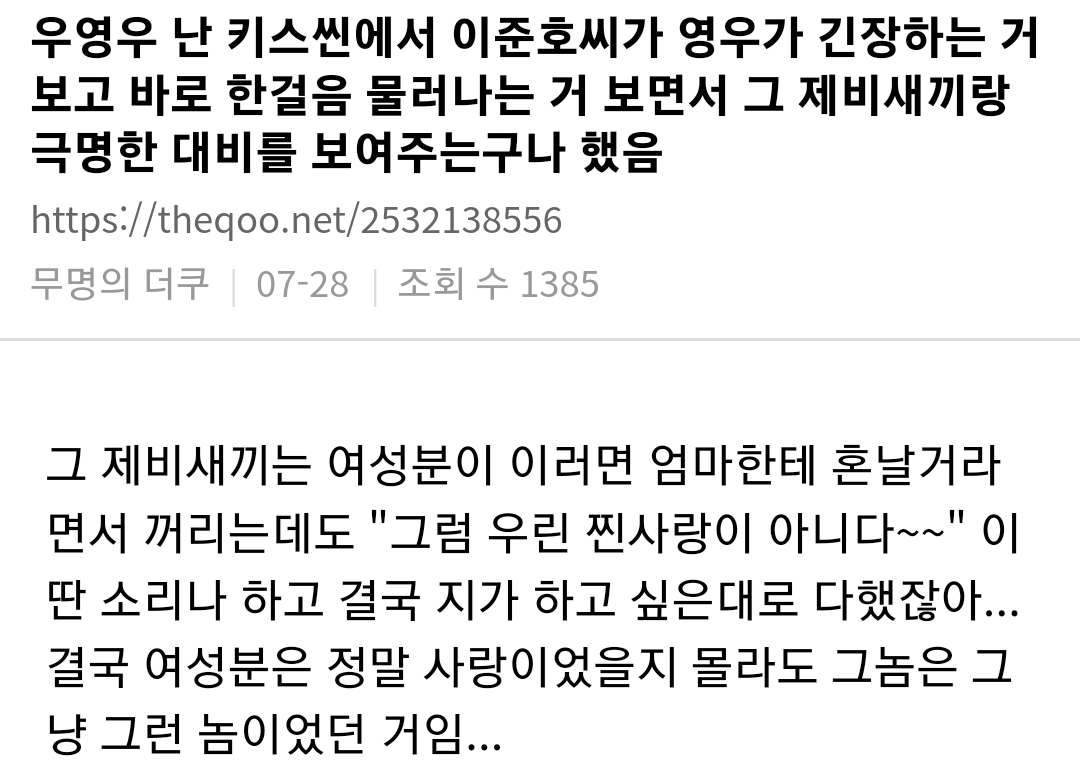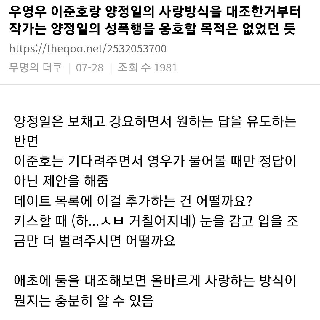 키스신보고 불호 생각을 하지 못한 원덬이 미디어를 쓰고, 소비하는입장에서 다양한 관점들을 이해하고 볼 필요성을 느껴 쓴 글이니 괜히 자기 의견이 맞다 주장하고 반대측을 싸잡고 쌈박질나는 댓이 달리질 않길 바람