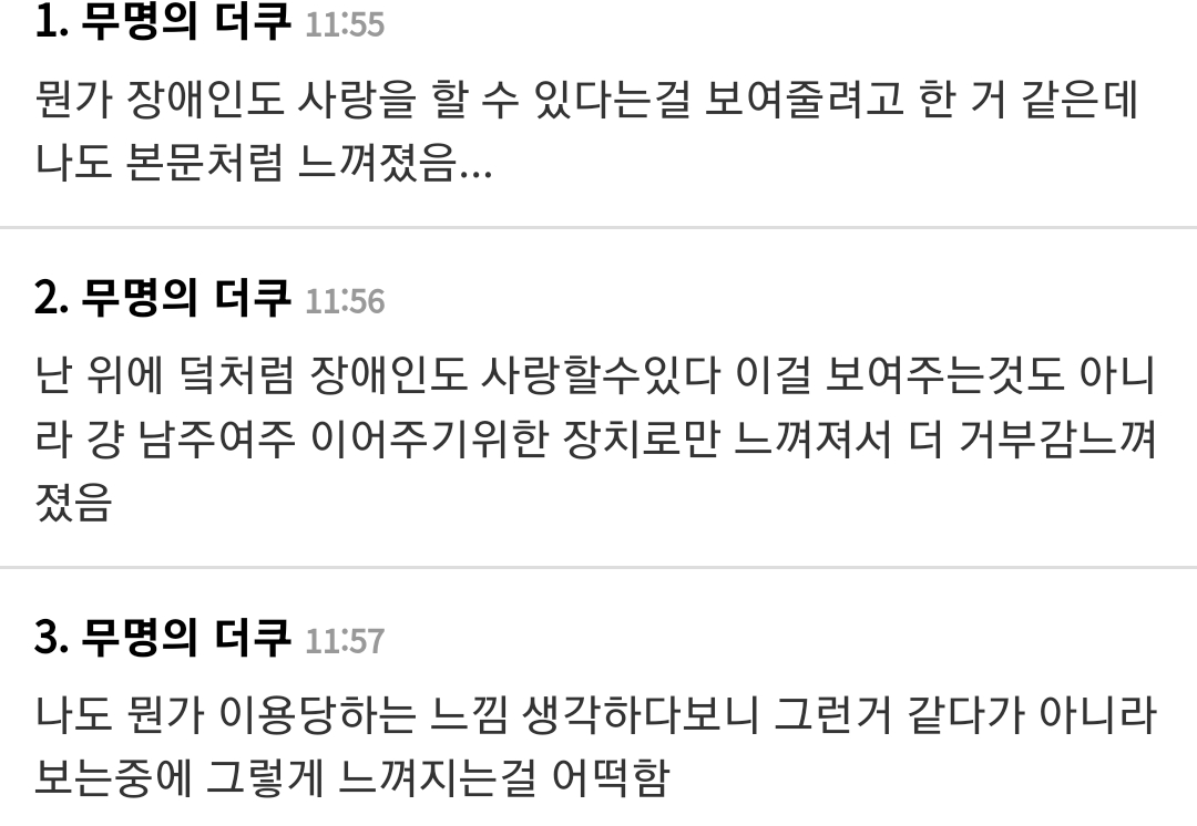 작성자다귀찮타 작성시간 24.03.11 난 전혀안불편했어. 스퀸십을 자기좋을대로만 하려고 했던 남성의 사례 뒤에 조심스럽게 서로 얘기하고 배려하고 하면서 맞춰가려는 모습이 나오니까 이게 정상이다 하는 느낌