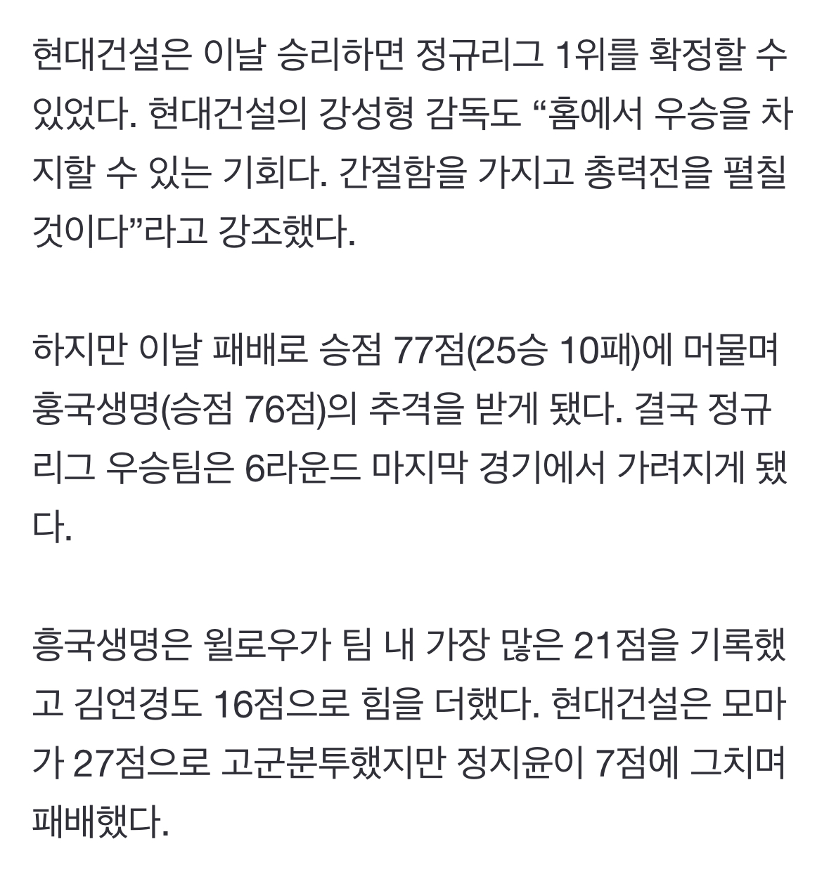 [여시뉴스데스크][MD수원] 김연경+윌로우 37점 합작! 정규리그 우승 불씨 살렸다...흥국생명, 현대건설에 3-0 완승→최종전에서 '1위' 결정된다 작성자슈퍼펭귄시리얼|작성시간24.03.12|조회수2,575 목록 댓글 16 글자크기 작게가 글자크기 크게가 출처: https://n.news.naver.com/sports/volleyball/article/117/0003812262[MD수원] 김연경+윌로우 37점 합작! 정규리그 우승 불씨 살렸다...흥국생명, 현대건설에 3-0 완승→[마이데일리 = 수원 최병진 기자] 흥국생명이 현대건설을 꺾으면서 정규리그 우승은 최종전에서 가려진다.흥국생명은 12일 오후 7시 수원실내체육관에서 펼쳐진 현대건설과의 ‘도드람 2023-2024 Vn.news.naver.com 다음검색 현재 게시글 추가 기능 열기 북마크 공유하기 신고 센터로 신고 댓글 댓글 16 댓글쓰기 답글쓰기 댓글 리스트 작성자AI호소인 | 작성시간 24.03.12 흥국아 믿고 있었다 작성자드람맘맘마 | 작성시간 24.03.12 조오오오온잼 끝까지간다 작성자성공하겠습니다 | 작성시간 24.03.12 제발 ㅠㅠㅠㅠ 작성자크림빵언니 | 작성시간 24.03.12 끝까지간다🔥🔥🔥 작성자파인애플스무딩 | 작성시간 24.03.12 제발 마지막 경기 예매 완료 했다구 댓글 전체보기
