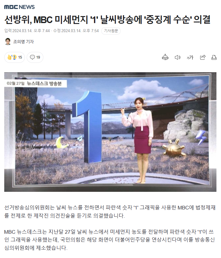 선방위, MBC 미세먼지 '1' 날씨방송에 '중징계 수순' 의결 (naver.com)