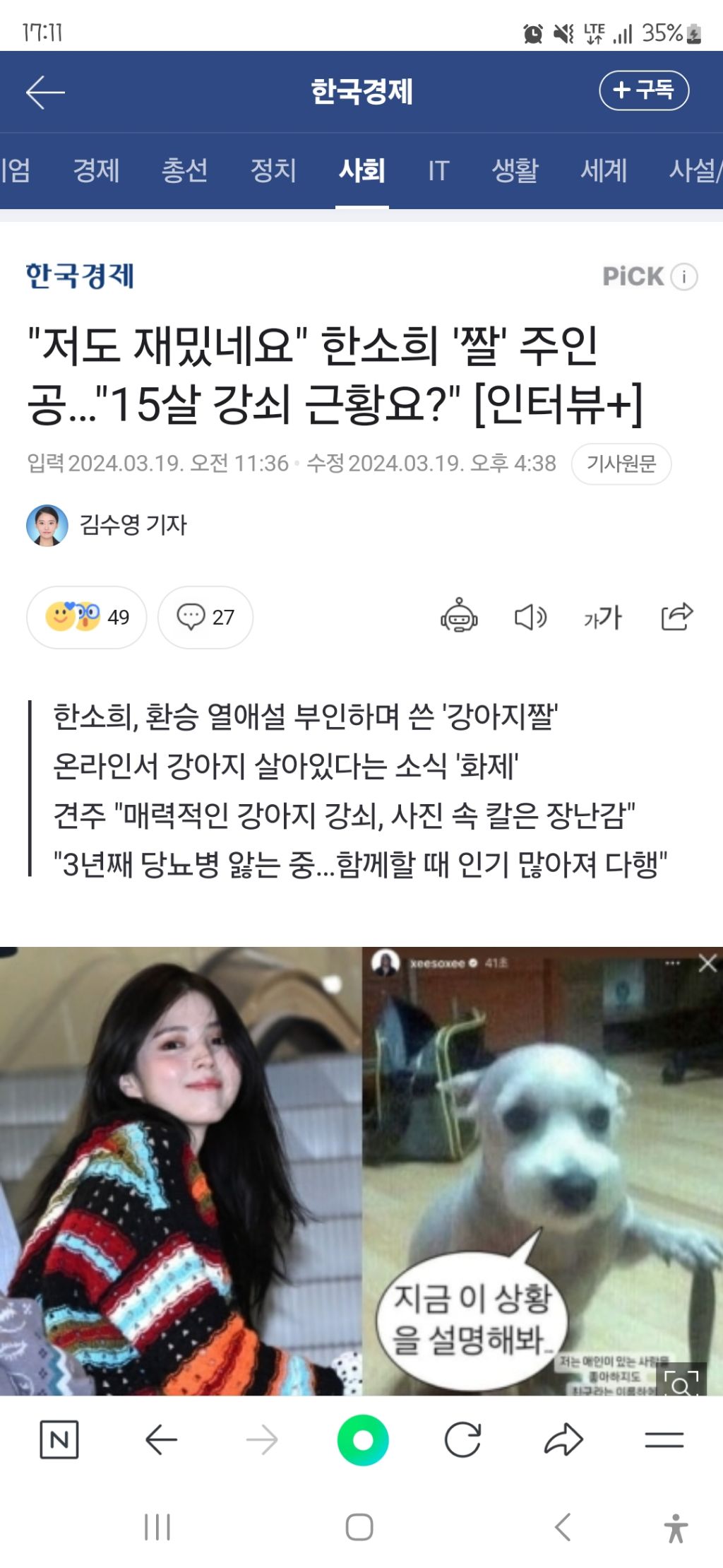 [여시뉴스데스크]"저도 재밌네요" 한소희 '짤' 주인공…"15살 강쇠 근황요?" [인터뷰+] 작성자뉴스속보|작성시간24.03.19|조회수16,483 목록 댓글 16 글자크기 작게가 글자크기 크게가 출처: https://naver.me/GjZsWIER"저도 재밌네요" 한소희 '짤' 주인공…"15살 강쇠 근황요?" [인터뷰+]배우 한소희가 사회관계망서비스(SNS)를 통해 류준열과의 환승 열애설을 부인하며 첨부한 사진 한 장. 순하게 생긴 강아지가 무시무시한 칼을 들고 있는 듯한 이 사진은 온라인상에서 오랫동안 n.news.naver.com전문출처로문제시삭제강쇠귀여워서 가져온기사임 다음검색 현재 게시글 추가 기능 열기 북마크 공유하기 신고 센터로 신고 댓글 댓글 16 댓글쓰기 답글쓰기 댓글 리스트 답댓글 작성자강영현유기현조승연 | 작성시간 24.03.23 아가야ㅜㅠㅠ 작성자복동아 사랑해 | 작성시간 24.03.19 강쇠야ㅠㅠㅠㅠㅠㅠㅠ오래오래오래 건강하자 작성자똥양꿍 | 작성시간 24.03.19 강쇠야 오래오래 행복해야한다~ 작성자월요일 싫어,,, | 작성시간 24.03.19 나 진자 저 짤 너무 좋아했어 동글동글한 머리ㅋㅋㅋㅋㅋㅋㅋㅋ 작성자강영현유기현조승연 | 작성시간 24.03.23 강쇠야 오래오래 건강하자 댓글 전체보기