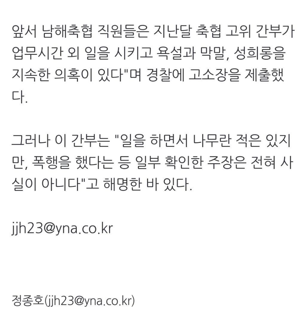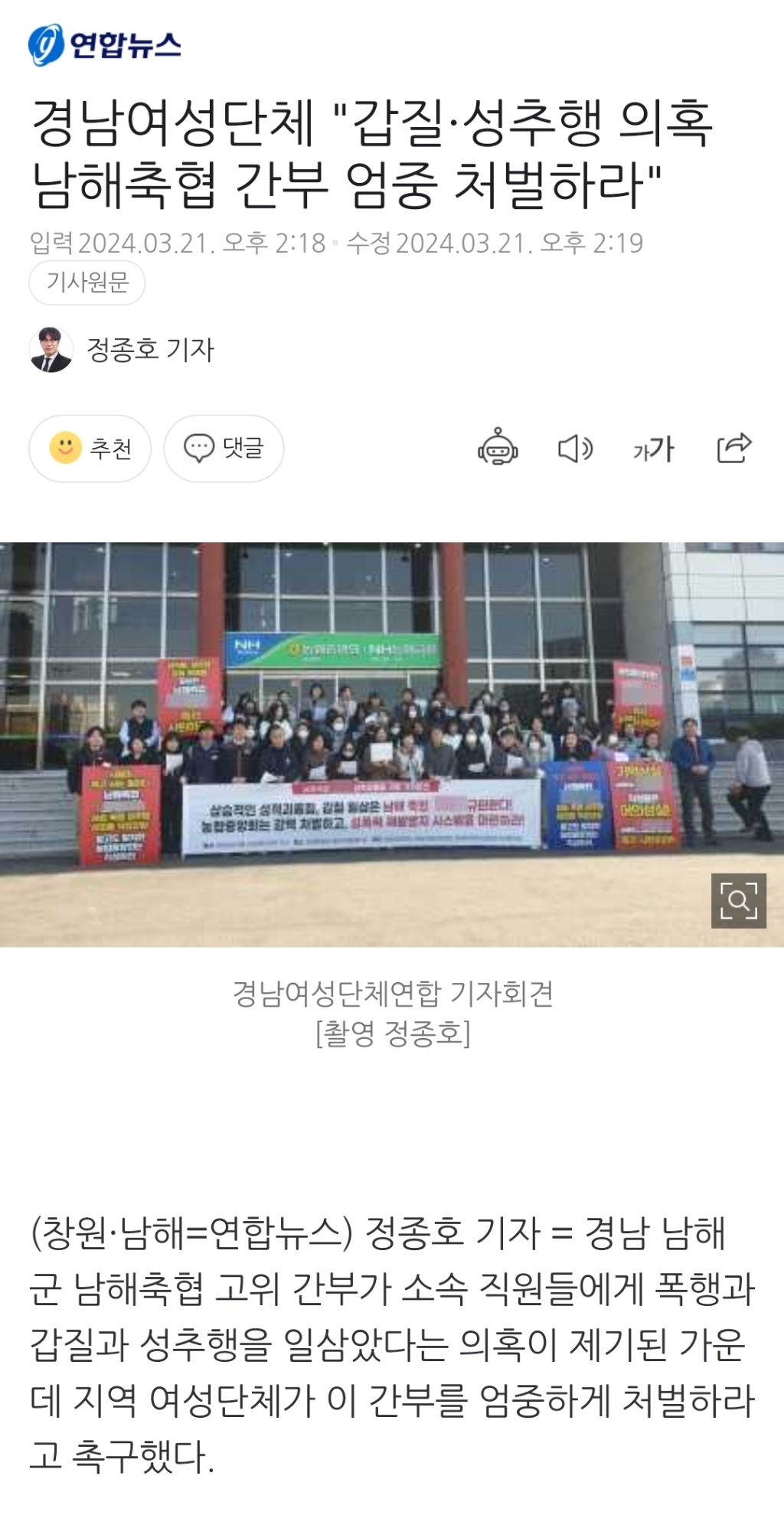 [여시뉴스데스크]경남여성단체 "갑질·성추행 의혹 남해축협 간부 엄중 처벌하라" 작성자천리길|작성시간24.03.21|조회수304 목록 댓글 0 글자크기 작게가 글자크기 크게가 출처: https://naver.me/5smKofKA경남여성단체 "갑질·성추행 의혹 남해축협 간부 엄중 처벌하라"경남 남해군 남해축협 고위 간부가 소속 직원들에게 폭행과 갑질과 성추행을 일삼았다는 의혹이 제기된 가운데 지역 여성단체가 이 간부를 엄중하게 처벌하라고 촉구했다. 경남여성단체연합 n.news.naver.com전문 출처로중략 다음검색 현재 게시글 추가 기능 열기 북마크 공유하기 신고 센터로 신고 댓글 댓글 0 댓글쓰기 답글쓰기 댓글 리스트