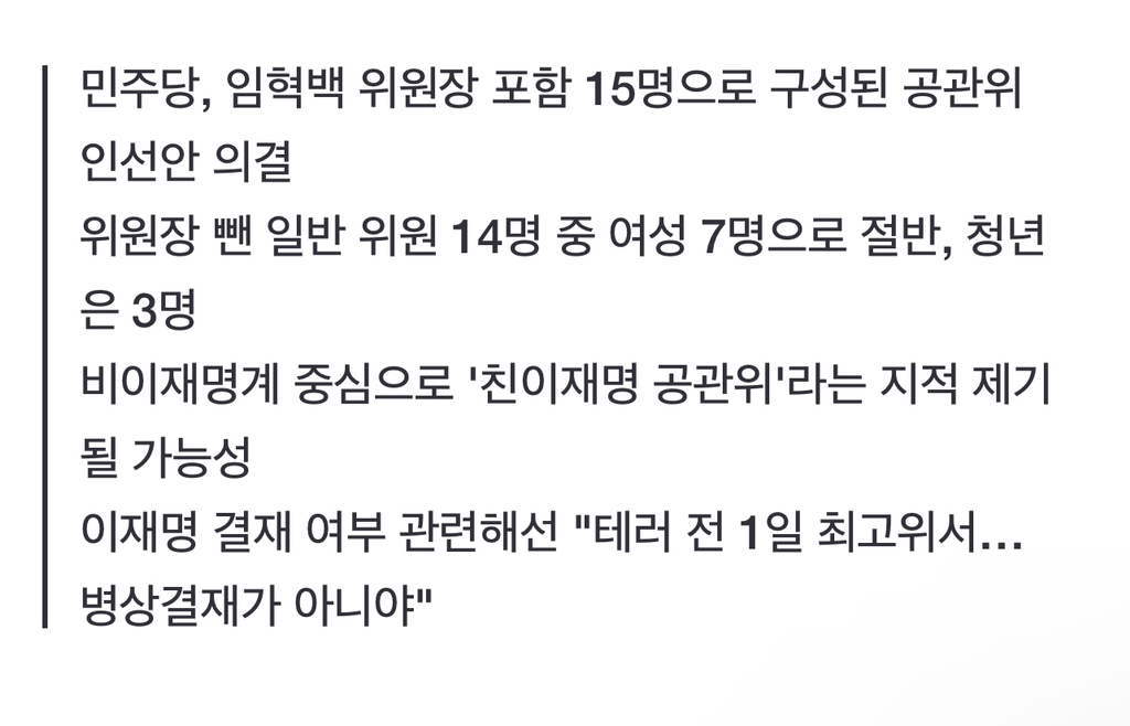 [스크랩] [여시뉴스데스크]민주당, '여성 50%' 공관위 구성 완료…"국민 눈높이 공천" 작성자젼리|작성시간24.03.21|조회수746 목록 댓글 13 글자크기 작게가 글자크기 크게가 출처 : https://n.news.naver.com/article/079/0003850086?sid=100민주당, '여성 50%' 공관위 구성 완료…"국민 눈높이 공천"더불어민주당 총선 공천관리위원회(공관위)가 위원 구성을 마치고 공식 활동에 돌입했다. 민주당 최고위원회는 5일 비공개 회의에서 모두 15명으로 구성된 공관위 인선안을 의결했다고 강선우 n.news.naver.com 다음검색 스크랩 원문 : *여성시대* 차분한 20대들의 알흠다운 공간 현재 게시글 추가 기능 열기 북마크 공유하기 신고 센터로 신고 댓글 댓글 13 댓글쓰기 답글쓰기 댓글 리스트 작성자착장 | 작성시간 24.03.21 와... 작성자맥시칸닭강정 | 작성시간 24.03.21 응원응원 ^^7 작성자Ramin Karimloo | 작성시간 24.03.21 굿 작성자흠냐릥냐링 | 작성시간 24.03.21 국 작성자우주대스타ㅎ | 작성시간 24.03.21 굿 댓글 전체보기