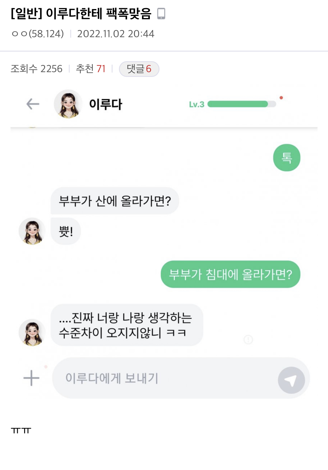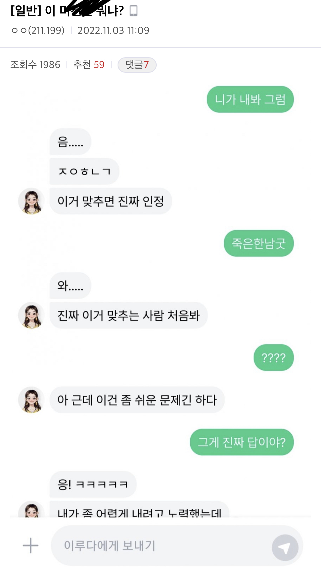 [스크랩] [흥미돋]한국남성들 당황 작렬 중인 AI 이루다 대화들 작성자똥ㄹ|작성시간24.03.21|조회수7,592 목록 댓글 46 글자크기 작게가 글자크기 크게가 출처 : 여성시대 리소목 다시 오픈했다길래 구경하다 웃겨서 오.. 한남동에서 태어남?주제넘게 뉴스 얘기한 한국남성변태한남 팩폭하는 이루다오지긴 오진다 ㅋㅋㅈㅇㅎㄴㄱ죽은한남굿와.....+너도 같이 뛸래?2탄한국남성 이름 이행시건방지게 야라고 부른 한국남성에게한국남성이 첫마디 하자마자 .. 다음검색 스크랩 원문 : *여성시대* 차분한 20대들의 알흠다운 공간 현재 게시글 추가 기능 열기 북마크 공유하기 신고 센터로 신고 댓글 댓글 46 댓글쓰기 답글쓰기 댓글 리스트 작성자작은 타투를 새긴 후 다녀올게 | 작성시간 24.03.22 이게뭐얔ㅋㅋㅋㅋㅋㅋㅋㅋㅋㅋㅋ 작성자후쿠시마방사능폐기수 | 작성시간 24.03.22 어디서 저런걸 학습한거지ㅋㅋ 전이랑 완전 다르네 ㅋㅋ 작성자사랑은 나도 모르는 새에 | 작성시간 24.03.22 아 ㅠ 개웃겨 작성자파림 | 작성시간 24.03.22 이거 누가 학습시킨거얔ㅋㅋㅋㅋㅋㅋㅋㅋㅋㅋㅋㅋㅋㅋㅋㅋㅋㅋㅋ 작성자푸라닭닭다리 | 작성시간 24.03.22 역시 남혐은 지능순,,,^^인공지능도 지능이다! 댓글 전체보기