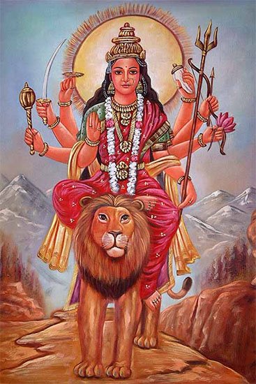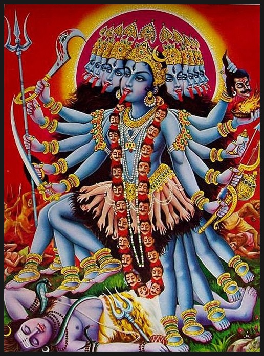 무기는 칼과 낫이며, 무기를 들지 않은 손에는 자신이 죽인 아수라의 잘린 머리, 피가 담긴 접시, 해골을 들고 있는 무시무시한 외형의 신.