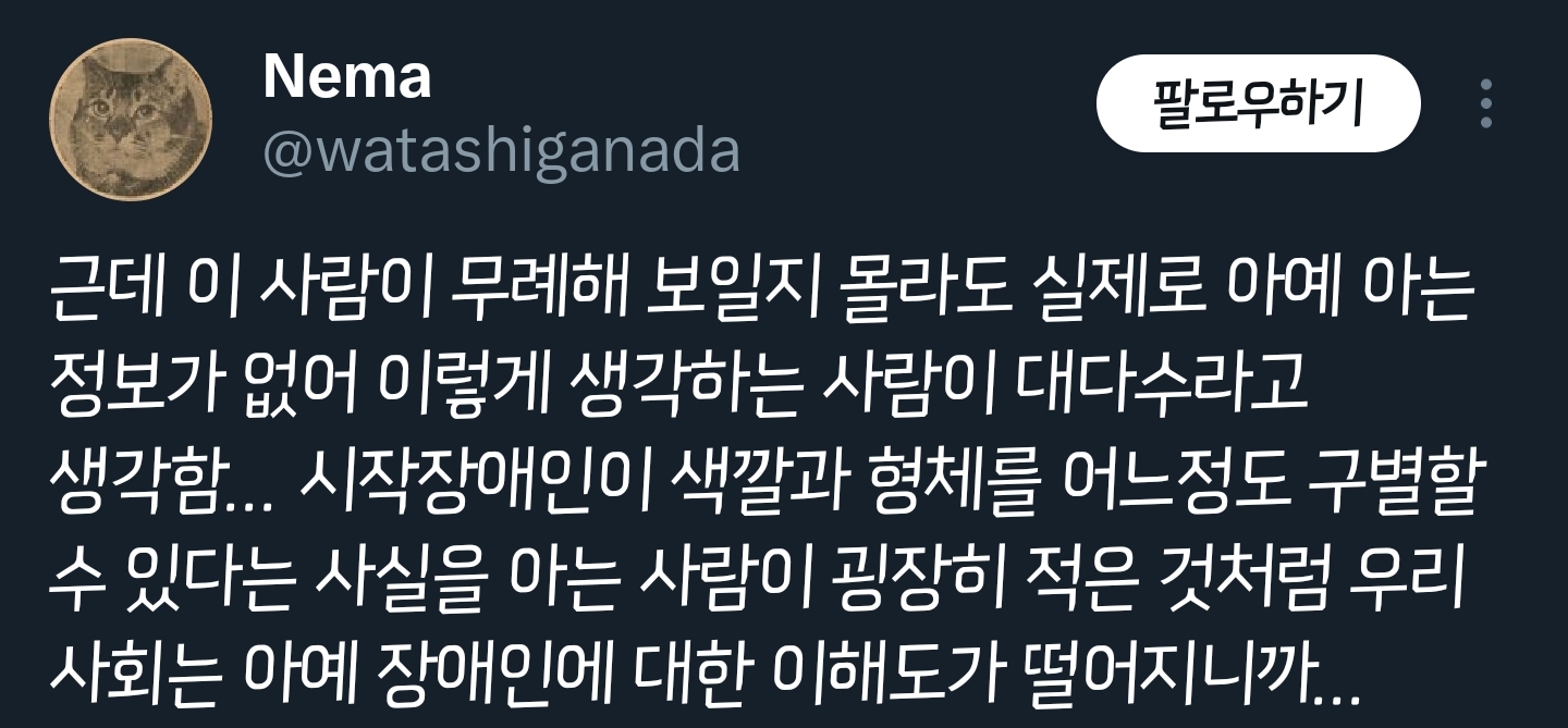 시각장애 - 간판 읽을 수 있음. 무조건 다 전맹이 아님