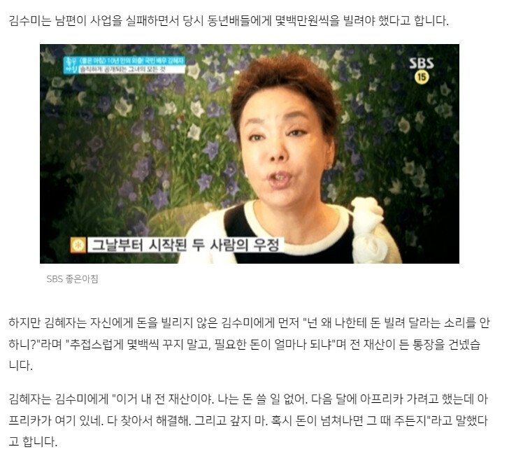 [흥미돋]김수미에게 전재산을 줬던 김혜자 작성자nero|작성시간24.03.23|조회수44,202 목록 댓글 35 글자크기 작게가 글자크기 크게가 출처: 여성시대 nero진짜 멋지신 분.. 다음검색 현재 게시글 추가 기능 열기 북마크 공유하기 신고 센터로 신고 댓글 댓글 35 댓글쓰기 답글쓰기 댓글 리스트 작성자김취만두 | 작성시간 24.03.23 ˗ˋˏ 와 ˎˊ˗ 그저 빛.. 작성자한마리두마리세마리 | 작성시간 24.03.23 와.. 정말 대단하셔. 아무리 소중한 친구여도 어떻게 전재산을 주냐.. 작성자춘식이는집순이 | 작성시간 24.03.24 뭐야 너무 멋있다.. 작성자능빡마우 | 작성시간 24.03.24 수미 님이 고마움을 아는 분 인 것 같아서(포로 운운) 더 근사해 작성자얼그레이스콘에아아 | 작성시간 24.10.25 와…. 댓글 전체보기