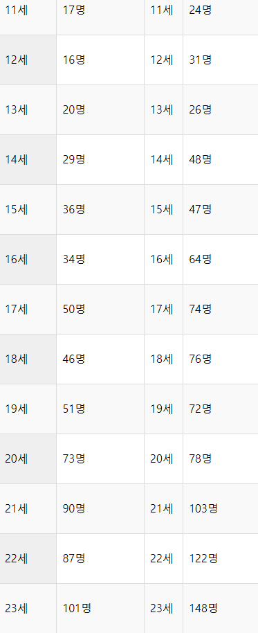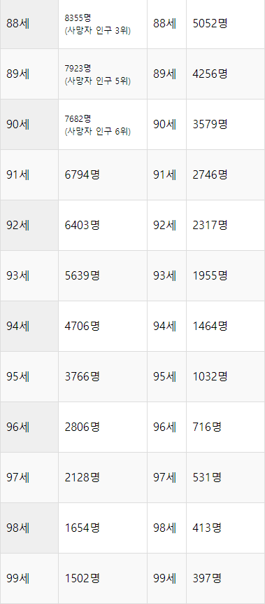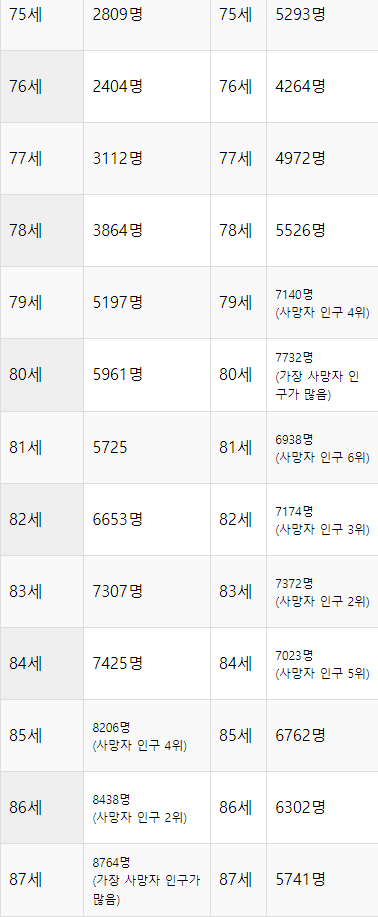 한국 여성의 경우 87세 - 86세 - 88세 - 85세 - 89세 - 90세 순서로 사망자 인구가 많음.