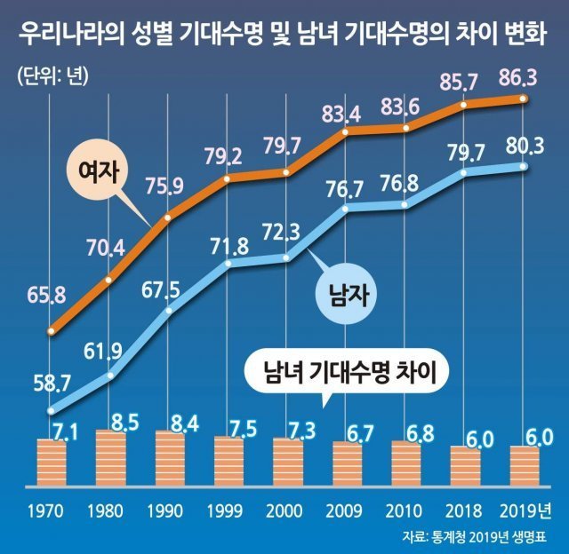 현재 언론에 해마다 보도되는 평균수명은 그해 태어나는 아기들의 기대수명을 의미함. 2022년 기준 남성 79.9세, 여성 86.5세라는 결과가 나왔음. 통계상 남성의 기대수명은 80세를 넘기기 힘든듯함